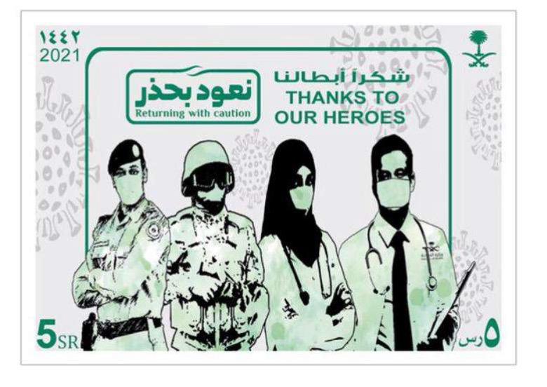 أصدرت مؤسسة البريد السعودي |سبل طابعاً بريدياً تذكارياً بعنوان” شكرا أبطالنا “من فئة “3 ريالات” وبطاقة بريدية من فئة “5 ريالات” ويأتي الطابع بمثابة شكر وتقدير لجهود أبطال الوطن في مواجهة جائحة كرونا وذلك نظير قيامهم بواجبهم بكل إخلاص وتميز منذ بداية ظهور الجائحة من أجل خدمة وطنهم والحفاظ على سلامة وصحة المواطنين والمقيمين وتقديمهم لأروع نماذج الوفاء لهذا البلد المعطاء.
