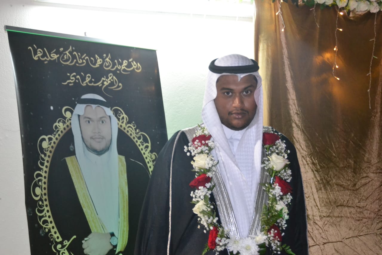 قائلا :” كم أنا سعيد في هذه الليلة الجميلة التي زف فيها أخي وابن خالي إلى عروسه ” وأضاف ” تعجز كلماتي عن وصف مشاعري تجاه صديقي وأخي الذي كسب حب الجميع من خلال أخلاقه النبيلة وتعامله الراقي وحسبي أن أدعو الله لهما بالتوفيق وأن يزرع المحبة في قلوبهما ويبعد عنهما أعين الحاسدين “.