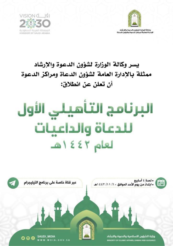 تطلق وزارة الشؤون الإسلامية والدعوة والإرشاد ممثلة بوكالتها للدعوة والإرشاد البرنامج التأهيلي الأول للدعاة والدعيات الجدد، والذي يستمر مدة أربع أسابيع بدء من يوم غد الأحد العاشر من شهر ذي العقدة لعام 1442هـ، بمحاضرات ودورات علمية مكثفة عبر البث المباشر، يقدمها نخبة من المختصين بالأمن الفكري والدعوة وأساليبها.