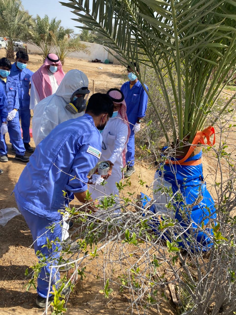 قام مشرف برنامج سوسة النخيل الحمراء بالفرع المهندس / فواز مسلم الجهني بعمل دورة تدريبية تطبيقية لعلاج النخيل من آفة سوسة النخيل بالطريقة الكيميائية الحديثة والمعتمدة وزارياً باستخدام اقراص مركب فوسفيد الالمينيوم (التبخير) وكذلك رفع كفاءة العاملين في الإدارة المتكاملة لحشرة سوسة النخيل الحمراء للحد من خطورتها والقضاء عليها، وتعريفهم بسلوك الحشرة والكشف المبكر عن الإصابة والأساليب الحديثة لذلك، إضافة إلى طرق الإبلاغ عن الإصابة والوسائل المناسبة للسيطرة عليه ، اتى ذلك بحضور مدير مكتب الوزارة المهندس هشام عبدالله المنزلاوي ونائبه الاستاذ / أمجد بن عبدالله ثلاب