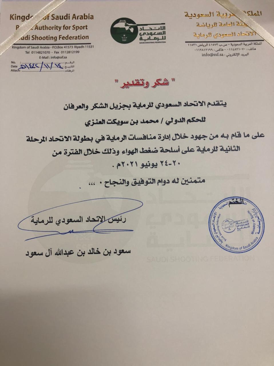 وبدوره قدم العنزي شكره لصاحب السمو رئيس الاتحاد السعودي للرمايه.