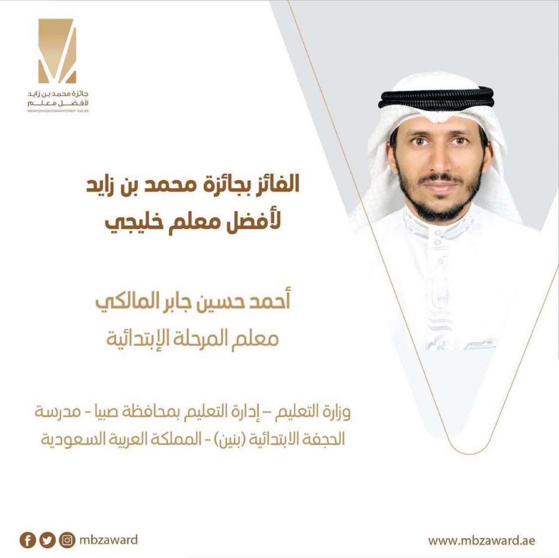من جانبه أعرب المعلم (المالكي) الفائز بهذه الجائزة عن سعادته بحصد هذا الفوز الذي يأتي تتويجا لدعم القيادة الرشيدة ووزارة التعليم للتميز والإبداع بالمملكة، مقدما شكره الخاص لسمو الشيخ محمد بن زايد على دعمه لهذه الجائزة التي تمثل له وساما غاليا على صدره. وقال (المالكي) إن هذه الجائزة مرت بالعديد من مراحل التقييم والمقابلات على مدار أكثر من سبعة أشهر، وأنه قدم الكثير من المبادرات للوصول لهذه الجائزة منها مبادرات على مستوى الطالب والبيئة التعليمية وعلى مستوى الوطن، من أهمها مبادرة (تحدي القراءة) التي تنمي حب الاطلاع لدى الطلبة، فضلا عن مبادراته الذاتية وذهابه لبعض الدول للحصول على الدورات التخصصية وتنفيذ بعض المبادرات النوعية.