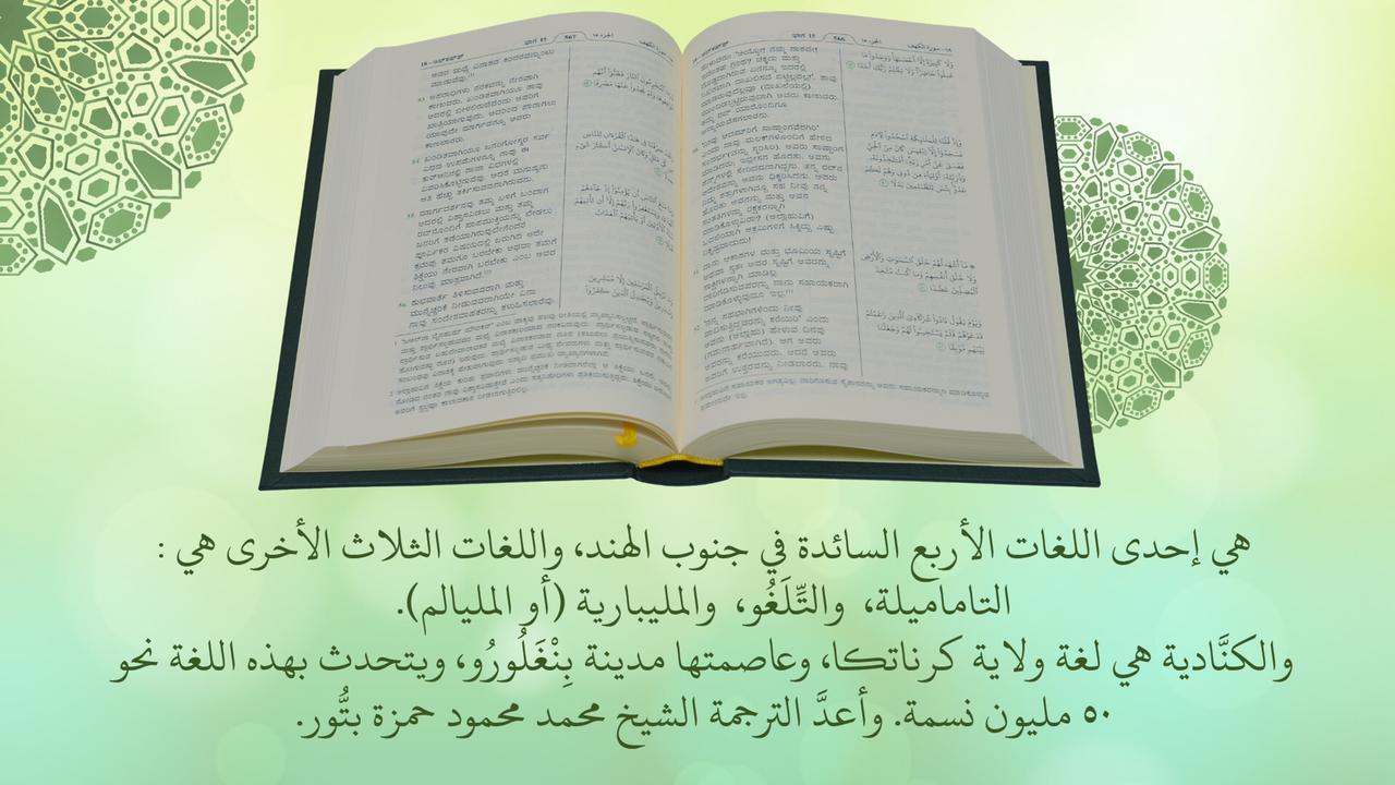 وجاء المشروع الثاني ترجمة معاني القرآن الكريم إلى اللغة الكَنَّادية: (ترجمة جديدة تطبع لأول مرة)، وهي إحدى اللغات الأربع السائدة في جنوب الهند في ولاية كرناتكا، وعاصمتها مدينة بِنْغَلُورُو، ويتحدث بهذه اللغة نحو 50 مليون نسمة، واللغات الثلاث الأخرى هي: التاميلية، والتِّلَغُو، والمليبارية (أو المليالم)، كما جاء المشروع الثالث الترجمة الكردية (باللهجة الكرمنجية): (ترجمة جديدة تطبع لأول مرة) ويتحدث باللغة الكردية نحو (20) مليون ناطق، لها لهجتان رئيستان: الشمالية المسماة بالكرمنجية ويُتحدَّث بها حوالي (١٠) مليون نسمة في الموصل بالعراق، وتمتدُّ إلى القفقاز في روسيا, والمشروع الامع ترجمة اللنغالا (أو اللغة اللنغالية): (ترجمة جديدة تطبع لأول مرة) تنتشر لغة اللنغالا في جمهورية الكنغو (أو الكونغو-برازافيل) في وسط إفريقيا، وعدد المتحدثين بها قرابة مليوني (٢٫٠٠٠٫٠٠٠) نسمة إنتاج (6000) نسخة من مصحف المدينة النبويةللمكفوفين بطريقة برايل، وبدء التوزيع.