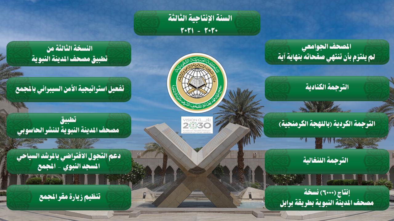 شهد مجمع الملك فهد لطباعة المصحف الشريف بالمدينة المنورة الذي تشرف على أعماله وزارة الشؤون الإسلامية والدعوة والإرشاد خلال السنة الإنتاجية 2020 ــ 2021م نقلة نوعية في مشاريعه التي نفذها وحجم الإنتاج من الإصدارات التي أنتجها المجمع بمختلف الاحجام وترجمات معاني القرآن الكريم والتي بلغت قرابة الـ 20 مليون نسخة من المصاحف رغم جائحة كورونا، إلى جانب إطلاق مشاريع ومنتجات تخدم كتاب الله تتماشى وتواكب حجم الدعم الذي توليه القيادة الرشيدة للمملكة والمتابعة المباشرة من معالي وزير الشؤون الإسلامية والدعوة والإرشاد المشرف العام على المجمع الشيخ الدكتور عبد اللطيف بن عبد العزيز آل الشيخ.