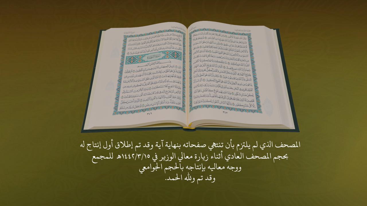 وجاءت المشاريع التي نفذها المجمع خلال العام الحالي على النحو التالي: المصحف الجوامعي (٣)، يطبع لأول مرة حيث أصدر المجمع الحجم الجوامعي من المصحف الذي لم يلتزم بأن تنتهي صفحاته بنهاية آية، وقد تم إطلاق أول إنتاج له بحجم المصحف العادي أثناء زيارة معالي الوزير للمجمع في 15/3/1442هـ، ثم وَجَّه معاليه بإنتاج الحجم الجوامعي منه، وقد تم ولله الحمد.