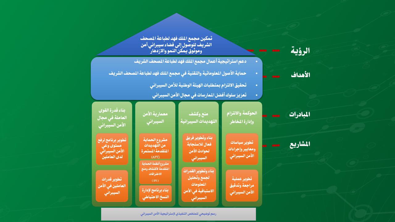 كما تم تفعيل استراتيجية الأمن السيبراني بالمجمع استجابةً للأمر السامي الكريم بأن على جميع الجهات الحكومية رفع مستوى أمنها السيبراني، تم إعداد استراتيجية الأمن السيبراني لتمكين المجمع من الوصول إلى فضاء سيبرانيآمن وموثوق، حيث تهدف الإستراتيجية إلى دعم اعمال المجمع، وحماية الأصول المعلوماتية والتقنية بالمجمع، وتحقيق الالتزام بمتطلبات الهيئة الوطنية للأمن السيبراني، وتعزيز سلوك أفضل الممارسات في مجال الأمن السيبراني، حيث تتضمن الإستراتيجية مبادرات في الحوكمة والالتزام وإدارة المخاطر، ومنع وكشف التهديدات السيبرانية، ومعمارية الأمن السيبراني، وبناء قدرة القوى العاملة في مجال الأمن السيبراني، كما اشتملت الاستراتيجية على 9 مشاريع تطويريه لتنفيذ هذه المبادرات.