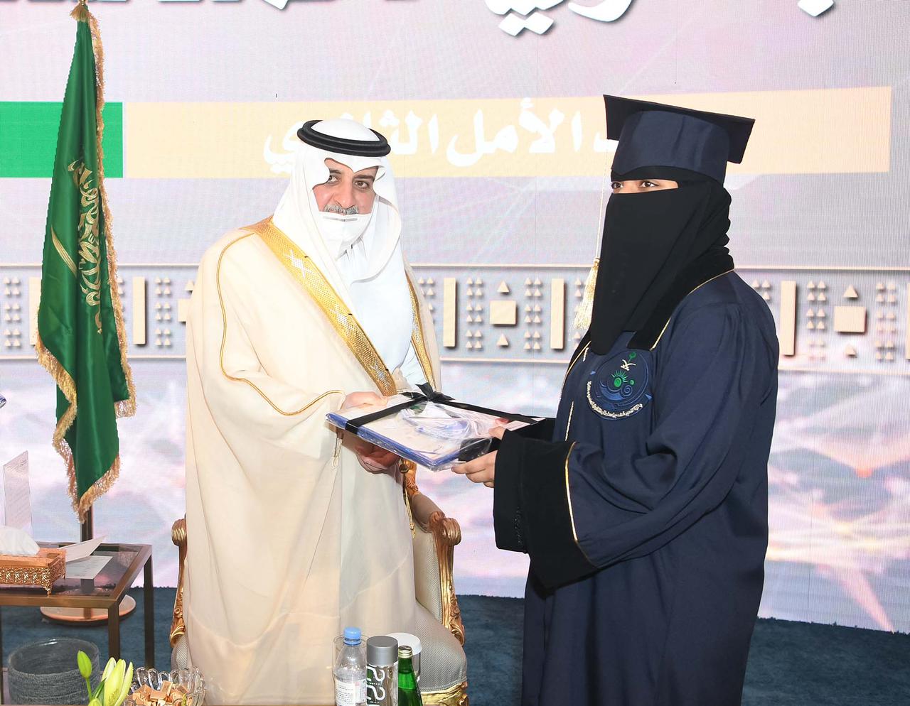 وفور وصول سموه بدأ الحفل المعد بهذه المناسبة بتلاوة آيات من القرآن الكريم، ثم ألقيت كلمة المتفوقين في التحصيل الدراسي ألقتها نيابة عنهم الطالبة هتون ابراهيم القرشي والتي أعربت فيها بإسمها ونيابة عن زملائها المتميزين عن سعادتهم بهذه الرعاية والحفاوة من قبل سمو أمير منطقة تبوك، لينطلقوا برحلتهم في خدمة دينهم ثم مليكهم والوطن الذي يفخرون دائما وأبدا بالانتماء إليه.
