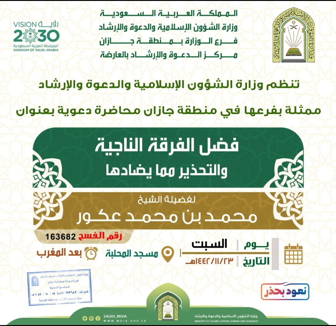 نظمت وزارة الشؤون الإسلامية والدعوة والإرشاد ممثلة بفرعها في منطقة جازان ومركز الدعوة في محافظة العارضة مساء أمس السبت الثالث والعشرين من شهر ذي القعدة 1442 هجرية محاضرة دعوية وعظية بعنوان (فضل الفرقة الناجية والتحذير مما يضادها) القاها فضيلة الشيخ محمد بن محمد عكور بين خلالها منهم الفرقة الناجية وماهي صفاتهم كما بين فضلهم ووجوب اتباعهم كما وضح أن هناك جهات تحاول هدم صفوفهم ويجب الحذر منهم , كما ستقام مساء اليوم الاحد الرابع والعشرون من الشهر نفسه المحاضرة الثانية بعنوان (الاستعداد ليوم الرحيل ) يلقيها فضيلة الشيخ علي بن زيد مدخلي يبين خلالها أن كل انسان على هذه الأرض سيأتي له يوم يغادر فيه هذه الحياة وينتقل من دار الفناء إلى دار البقاء فيجب عليه الاستعداد لهذا اليوم بالتزود بالطاعات وترك المعاصي .كما ستقام أخر المحاضرات في الثاني من شهر ذي الحجة 1442هـ بعنوان (معنى لا إله إلا الله شروطها وأركانها) يلقيها فضيلة الشيخ محمد بن زيد المدخلي في ذات المسجد يوضح خلالها معنى الشهادة وواجباتها وأركانها وشروطها حيث أنها الأساس لدخول الدين الحنيف وأن من ختم بها دخل الجنة .