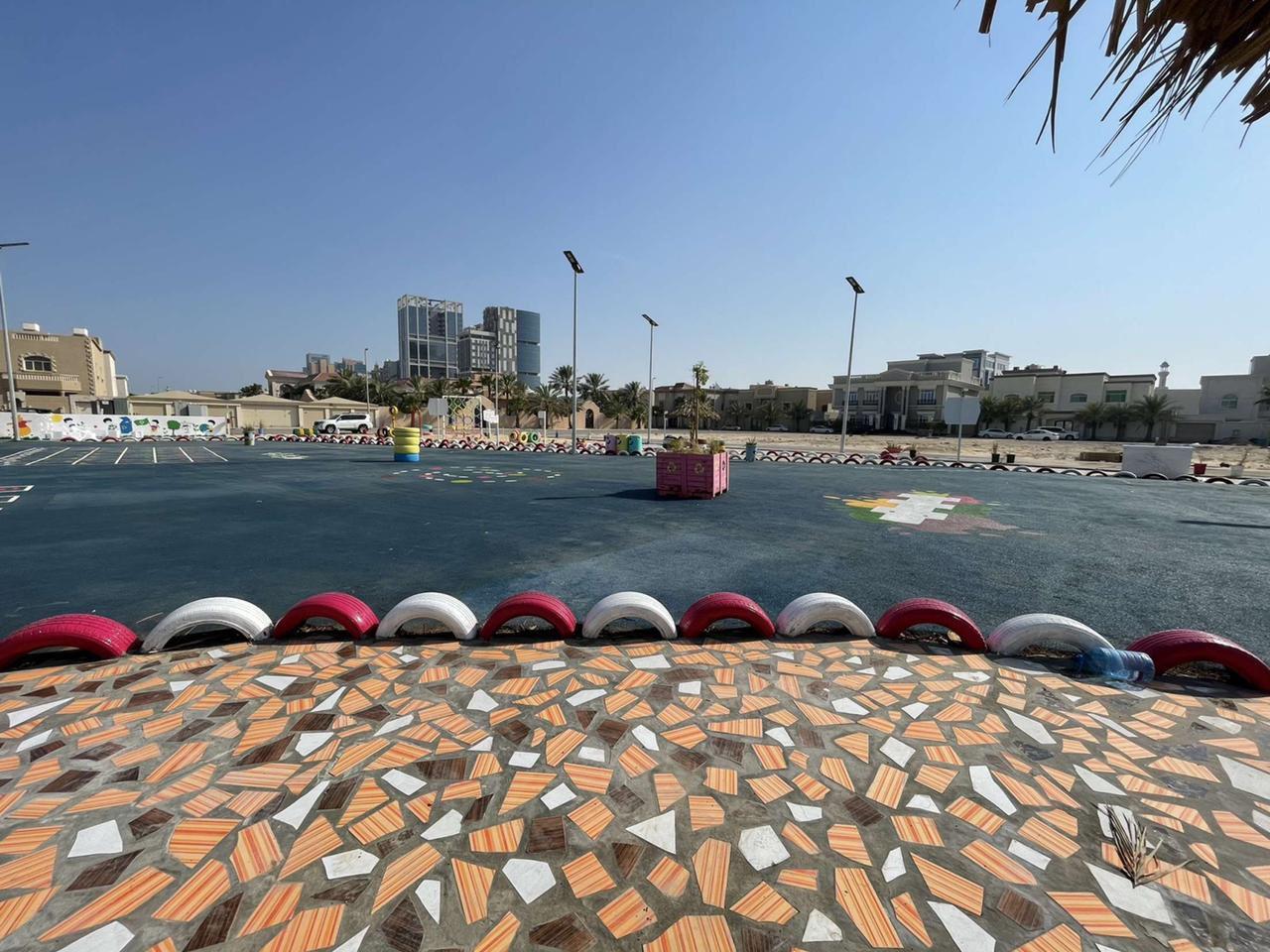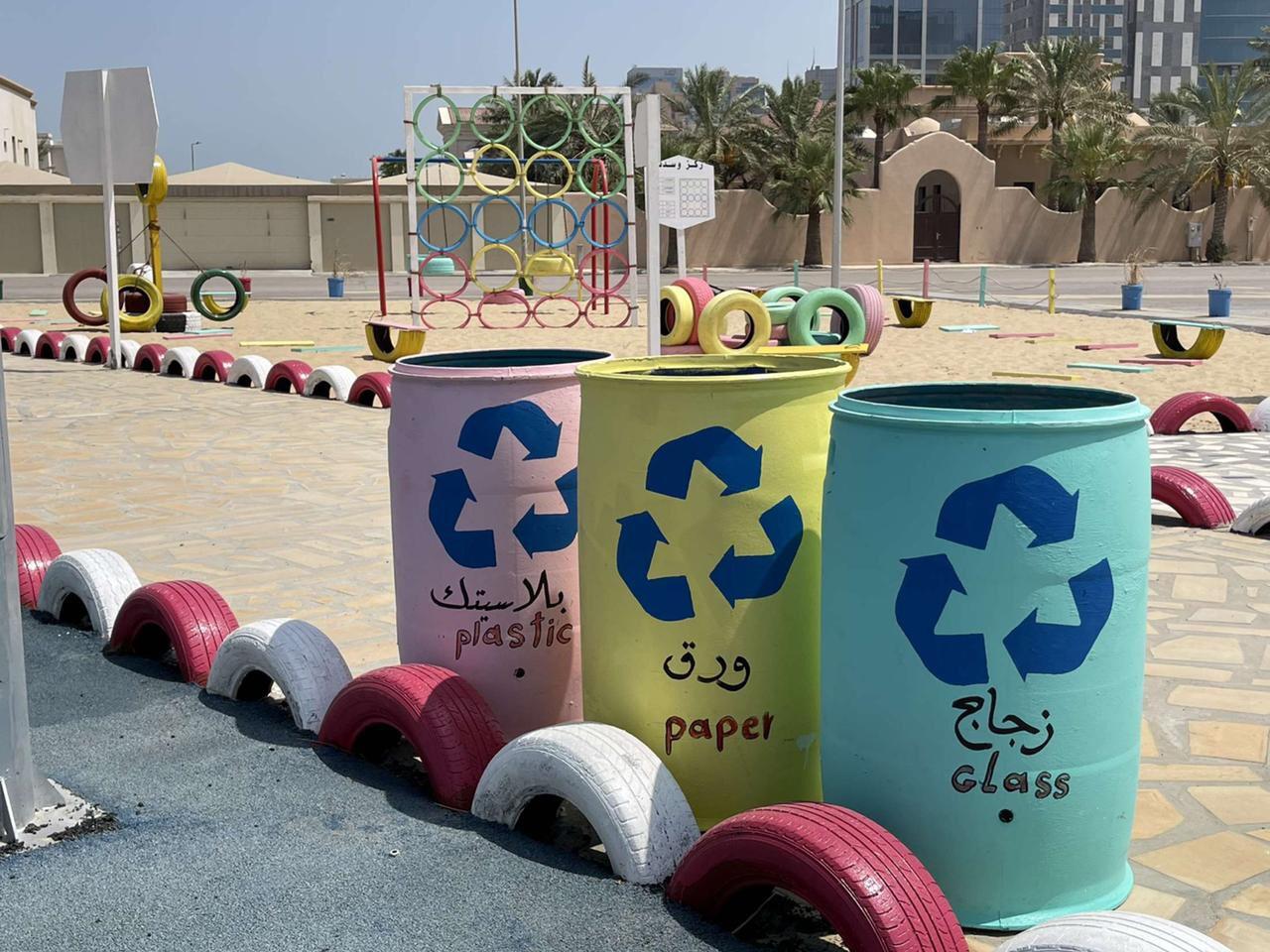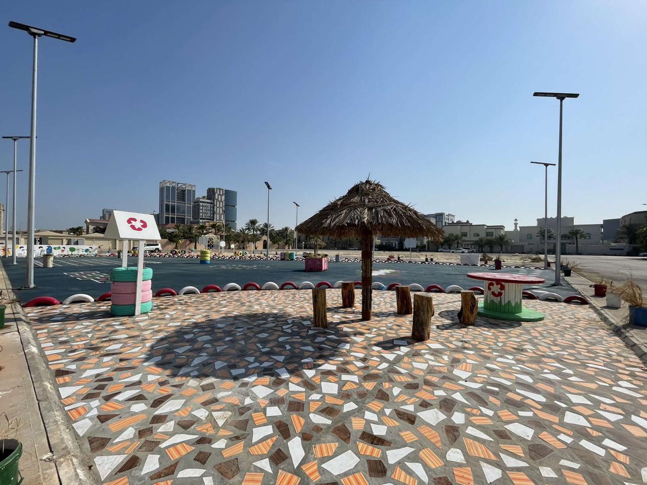 وأضاف المهندس سلطان الزايدي أن حديقة التدوير التي تم انشاؤها تأتي على مساحة تزيد عن 1800 متر مربع وتحتوي على ألعاب معاد تدويرها من اطارات السيارات وبعض الأجزاء الخشبية ومشايات من مخلفات الرخام والسيراميك وبعض الأحجار الموزعة لتشكل حديقة تكتمل فيها كل العناصر التي شكلت لوحة فنية بجمال محتوياتها وطريقة تصميمها، كما تحتوي على جلسات مظللة من بقايا سعف النخيل وطاولات خشبية، وحاويات تدوير ” بلاستيك – زجاج – ورق ” ، وأعمدة إنارة بالطاقة الشمسية، وزراعة أشجار بأحواض علب الدهانات والحاويات البلاستيكية وعربات اليد، وطاولة ألعاب تنس مصنوعة من بقايا حاوية، فيما تم استحداث أرضية من المطاط بمساحة 600م2 تحتوي على رسومات أرضية بأشكال تفاعلية .
