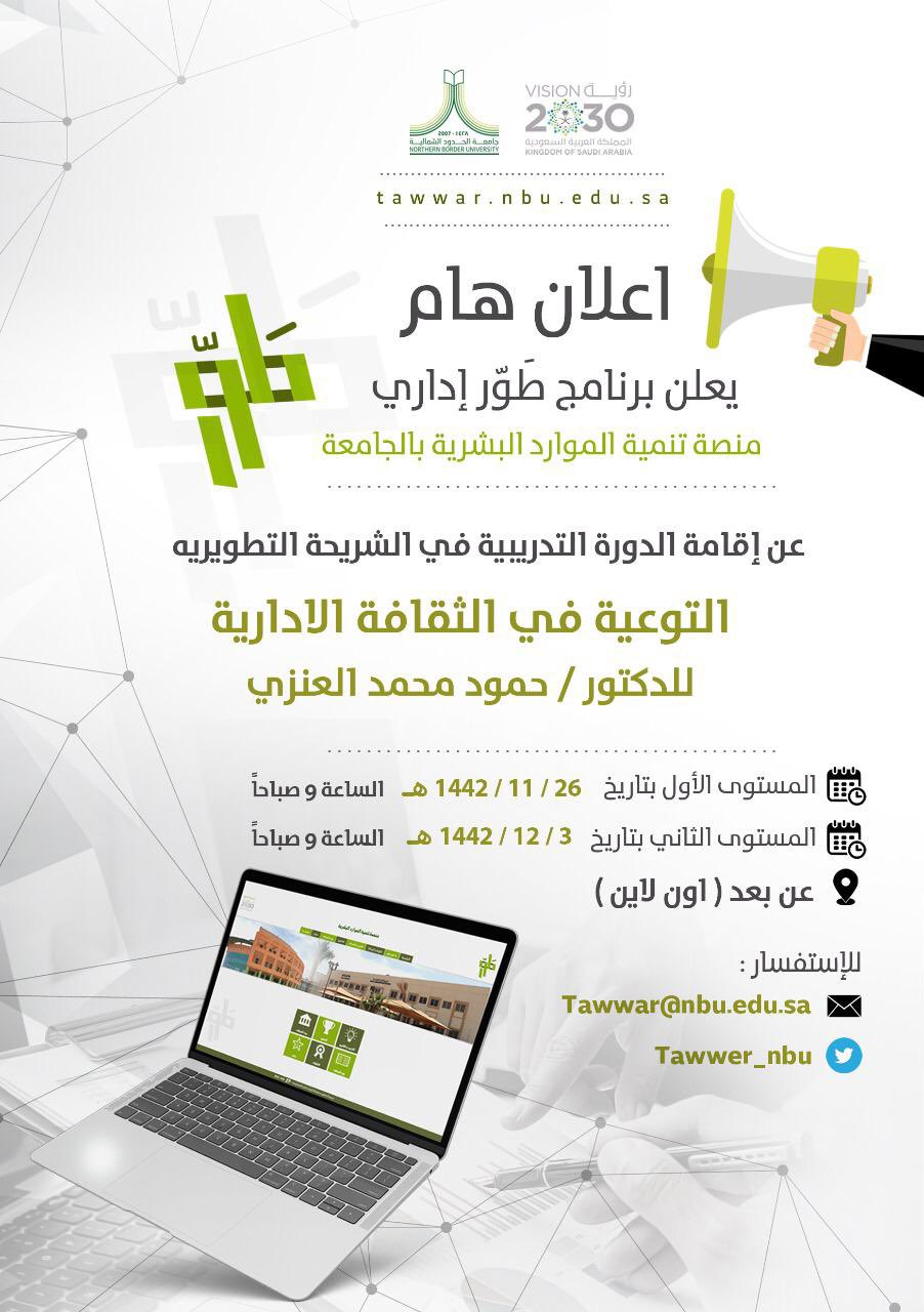 يقيم برنامج طور إداري بجامعة الحدود الشمالية دورة التوعية في الثقافة الإدارية للدكتور حمود محمد العنزي ، وكما يأتي المستوى الأول بتاريخ 1442/11/26