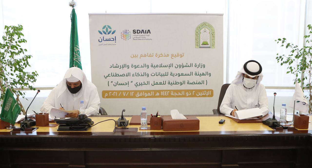 وقعت وزارة الشؤون الإسلامية والدعوة والإرشاد، اليوم الاثنين الثاني من شهر ذي الحجة 1442هـ، مذكرة تفاهم مع الهيئة السعودية للبيانات والذكاء الاصطناعي، وذلك في مقر الوزارة بالرياض، حيث وقعها وكيل الوزارة لشؤون الدعوة والإرشاد المكلف الشيخ عبدالعزيز بن محمد الشعلان ممثلاً عن الوزارة، والرئيس التنفيذي لمنظومة إحسان للعمل الخيري الأستاذ عبدالعزيز بن أحمد الحمادي ممثلاً عن الهيئة، بحضور عدد من المسؤولين من الجانبين.