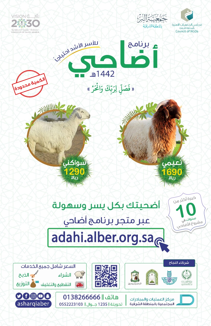 أعلنت جمعية البر بالمنطقة الشرقية عن أسعار أضاحي هذا العام 1442 وقال الأمين العام لجمعية البر بالمنطقة الشرقية نائب رئيس مجلس الجمعيات بالمنطقة سمير بن عبد العزيز العفيصان أن الجمعية تنفذ برنامج أضاحي سنويا لإحياء شعيرة الأضحية والتيسير على المضحي في أداء الشعيرة، مشيراً إلى أن سعر الأضحية النعيمي هذا العام ببرنامج أضاحي التابع للجمعية هو 1690 ريالا والسواكني 1290ريالا مؤكدا أن هذه الأسعار تشمل الذبح والتقطيع والتغليف والتجميد والتوزيع على المستحقين وأكد أن المضحي عند شراء الأضحية تتولى الجمعية عملية توزيعها على المستحقين وتضمن وصولها لمستحقيها المسجلين بالجمعية من الأسر الأشد حاجة حيث تم التأكد من استحقاقهم من خلال فريق بحث اجتماعي متخصص في بحث حالات الأسر مبينا أن الجمعية ترسل رسائل للمضحين فور ذبح الأضحية في وقتها الشرعي تفيدهم بذبح أضحيتهم للتحلل، قائلا أن نجاح جهود الجمعية في الأضاحي سنويا و في تنفيذ برنامج زكاة الفطر الموحد جاء بتوجيهات سمو أمير المنطقة الشرقية ورئيس مجلس إدارة جمعية البر بالمنطقة الشرقية الأمير سعود بن نايف بن عبدالعزيز وسمو نائبه الأمير أحمد بن فهد بن سلمان ، حيث دعم سموهما المشروعات والبرامج التي تخدم أفراد المجتمع وتحقق التنمية بالمنطقة، ودعا العفيصان المواطنين والمقيمين الراغبين في أداء شعيرة الأضحية لزيارة الرابط