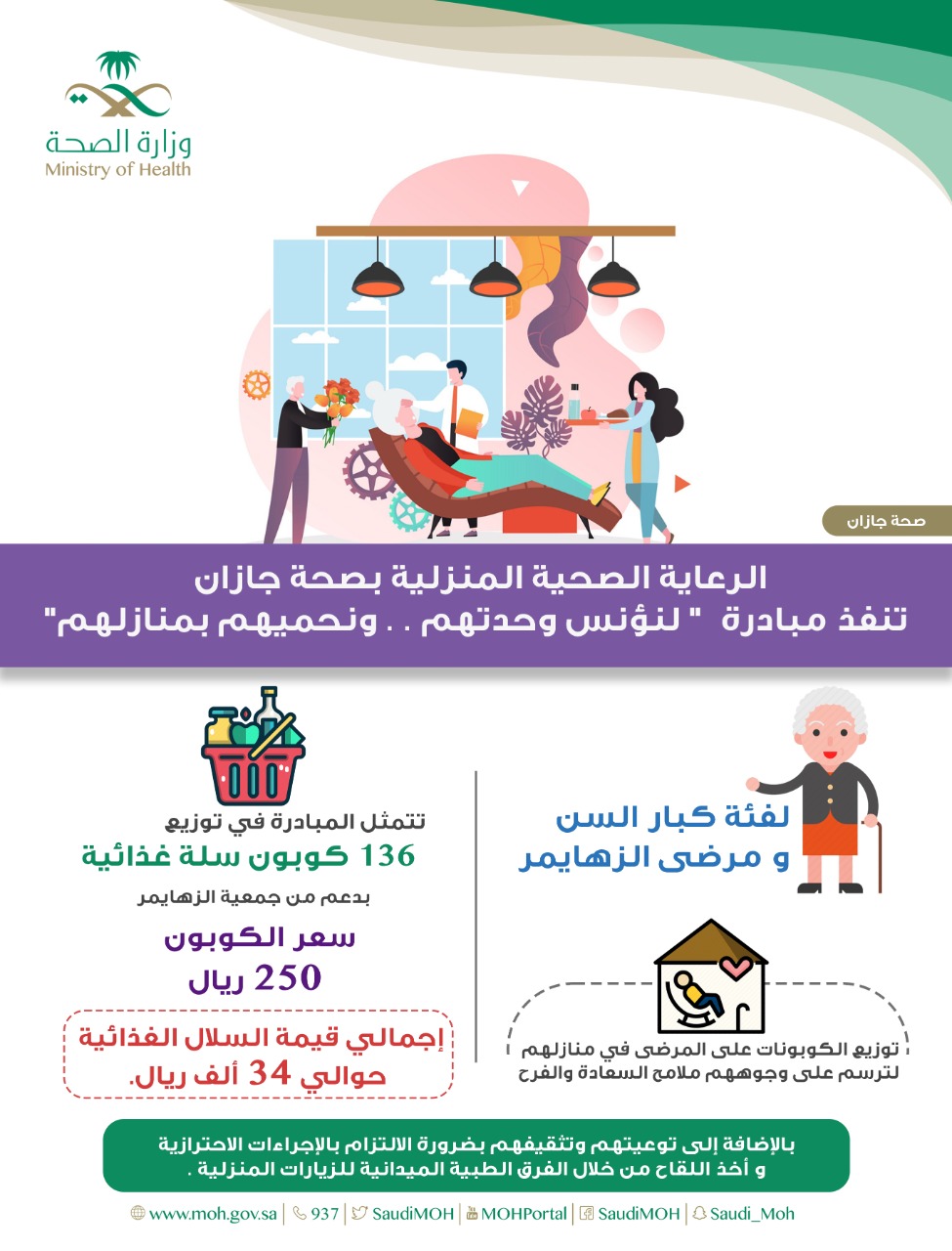 بدعم من جمعية الزهايمر نفذت صحة جازان ممثلة بإدارة الرعاية الصحية المنزلية مبادرة “لنؤنس وحدتهم.. ونحميهم بمنازلهم” لفئة كبار السن ومرضى الزهايمر، وتتمثل المبادرة في توزيع 136 كوبون سلة غذائية سعر الكوبون 250 ريال، وبلغ إجمالي قيمة السلال الغذائية حوالي 34 ألف ريال.