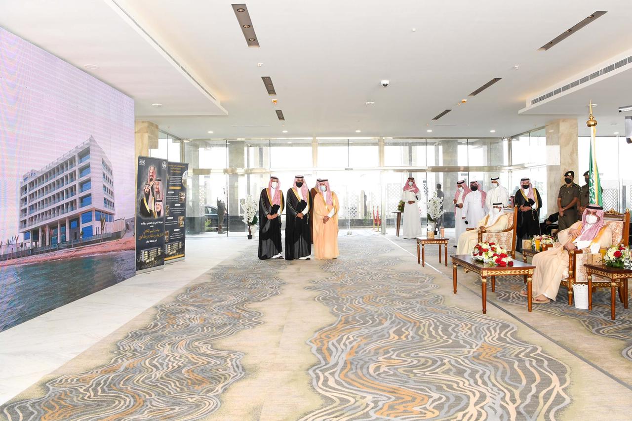 بعدها شاهد سموه عرضاً مرئي عن مشروع ” الفندق ” أحد أهم المشاريع الإستثمارية بالمحافظة والذي سوف يتم تشغليه قريباً بعد اكتمال التجهيزات اللازمة ، واستمع سموه لشرح من المدير التنفيذي للفندق المهندس فارس بن لافي الفايدي عن المشروع الذي بلغت نسبة الإنجاز فيه ال 96% وشيد على مساحة تفوق السبعة آلاف متر مربع ، ويضم 152 غرفةً وجناحاً ، وبمواصفات خمس نجوم عقب ذلك تسلم سموه هدية تذكارية من مالك المشروع بهذه المناسبة .