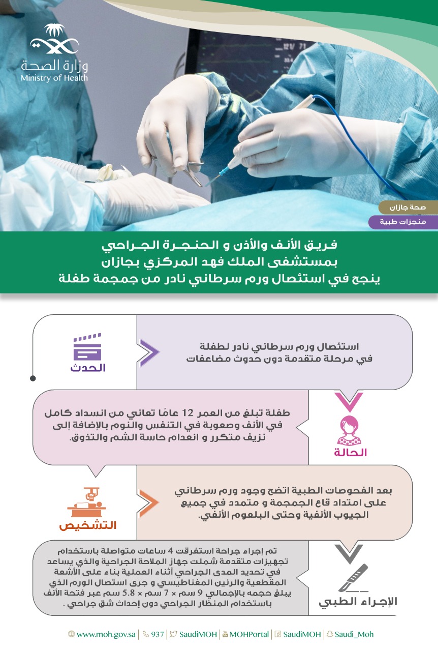 نجح فريق الأنف والأذن والحنجرة بمستشفى الملك فهد المركزي بجازان في استئصال ورم سرطاني نادر لطفلة في مرحلة متقدمة دون مضاعفات ولله الحمد.