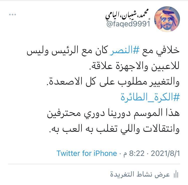 اعلن الكابتن محمد بن شيبان اليامي مدير المنتخب الأول للكرة الطائرة سابقاً بتغريدة عبر حسابه الرسمي في تويتر أن خلافه مع نادي النصر كان مع رئيس النادي وليس مع اي اطراف اخرى وقد المح شيبان في تغريدة أخرى أنه كان يخطط لاستقطاب افضل اللاعبين المحليين وثلاثة لاعبين محترفين على مستوى فني متقدم.