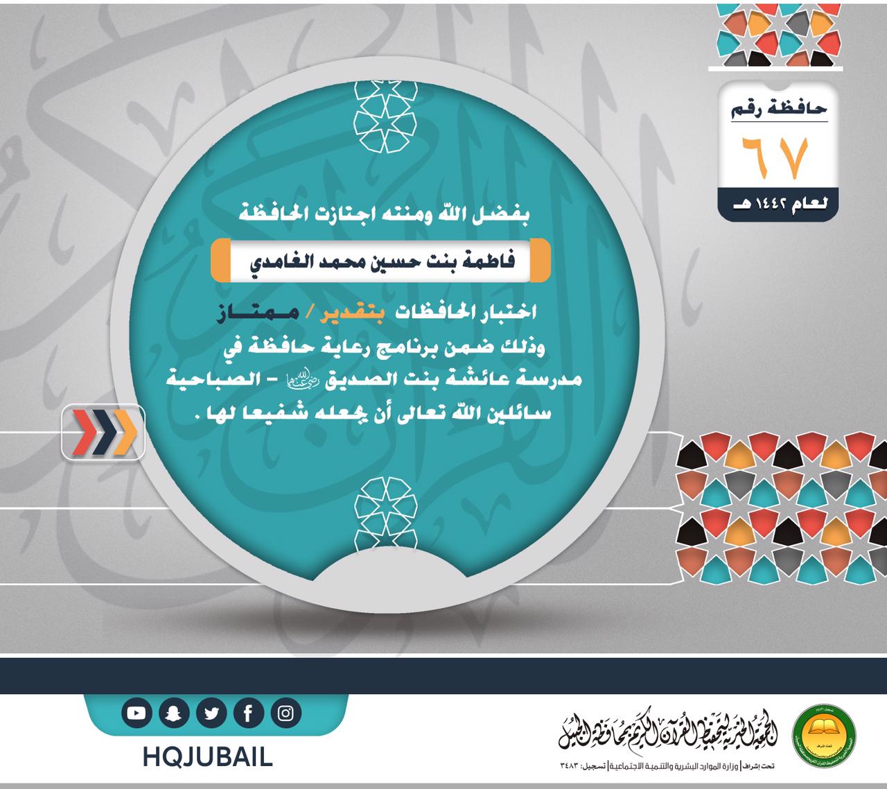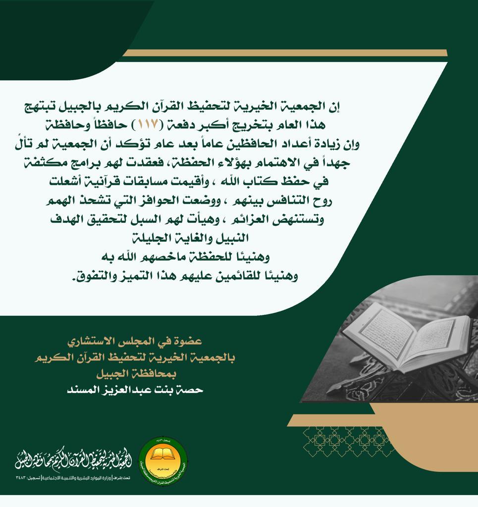 أعلنت الجمعية الخيرية لتحفيظ القرآن الكريم بمحافظة الجبيل، وصول عدد الحافظين لكتاب الله للعام 1442هـ لـ 117 حافظاً وحافظة, من بينهم اصغر حافظة عمرها 9 سنوات, واكبر حافظة عمرها 63 سنة..