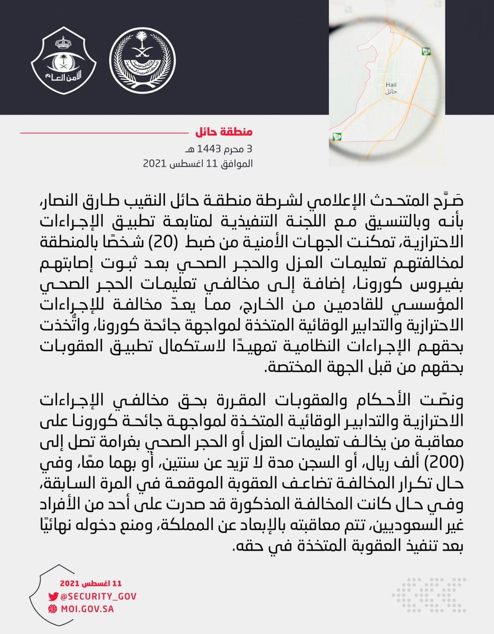صَرَّح المتحدث الإعلامي لشرطة منطقة حائل النقيب طارق النصار، بأنه وبالتنسيق مع اللجنة التنفيذية لمتابعة تطبيق الإجراءات الاحترازية، تمكنت الجهات الأمنية من ضبط (20) شخصًا بالمنطقة لمخالفتهم تعليمات العزل والحجر الصحي بعد ثبوت إصابتهم بفيروس كورونا، إضافة إلى مخالفي تعليمات الحجر الصحي المؤسسي للقادمين من الخارج، مما يعدّ مخالفة للإجراءات الاحترازية والتدابير الوقائية المتخذة لمواجهة جائحة كورونا، واتُّخذت بحقهم الإجراءات النظامية تمهيدًا لاستكمال تطبيق العقوبات بحقهم من قبل الجهة المختصة.