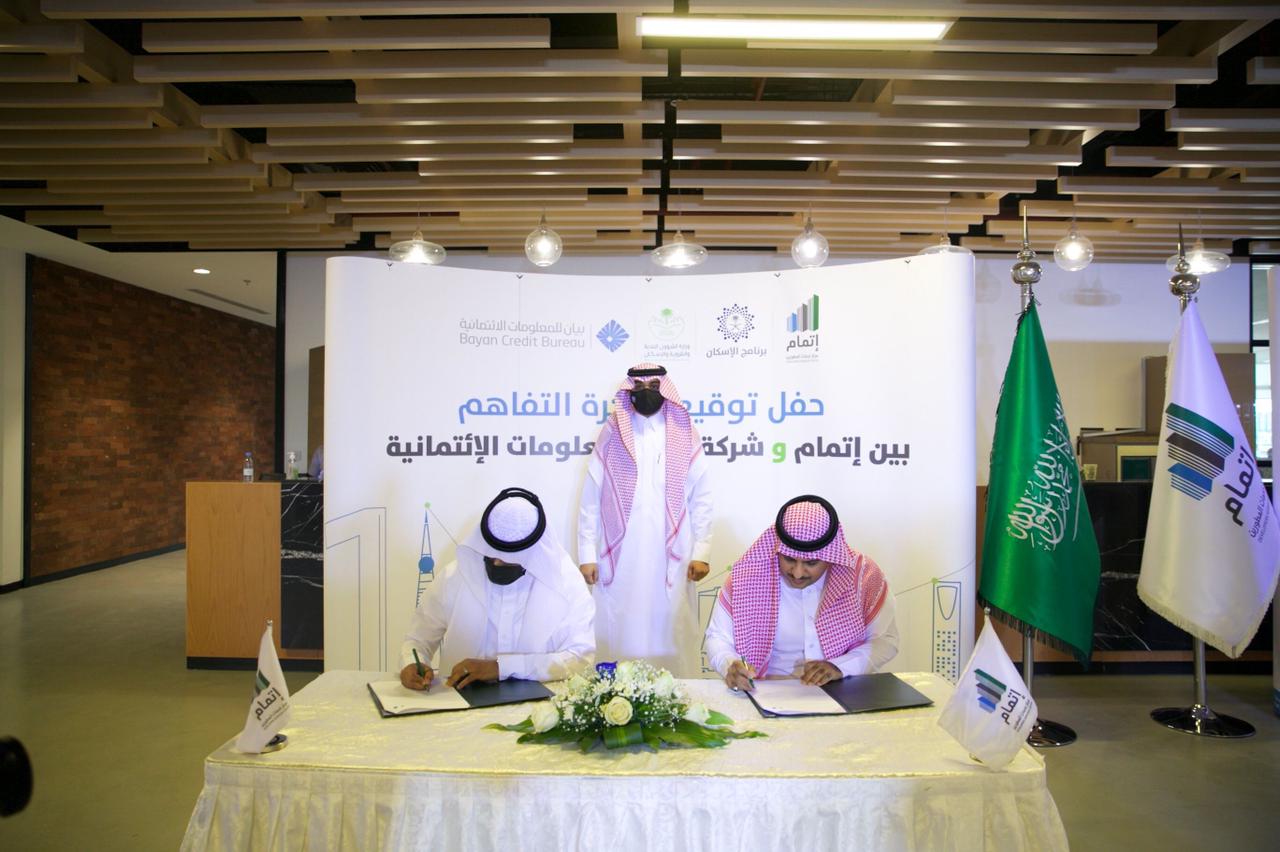 ووقع الاتفاقية من جانب مركز “إتمام” مدير عام مركز خدمات المطورين العقاريين “إتمام” المهندس عبد الوهاب بن مسفر القحطاني، ومن جانب بنك الرياض الرئيس الأول لمصرفية الشركات محمد بن عبدالعزيز أبو النجا، ومن جانب شركة بيان للمعلومات الائتمانية مدير عام إدارة تقنية المعلومات المهندس محمد بن فيصل بامقدم؛ ضمن جهود المركز لتحقيق مستهدفات برنامج الإسكان – أحد برامج رؤية المملكة 2030-، لزيادة نسبة التملك السكني للأسر السعودية إلى 70% بحلول 2030.