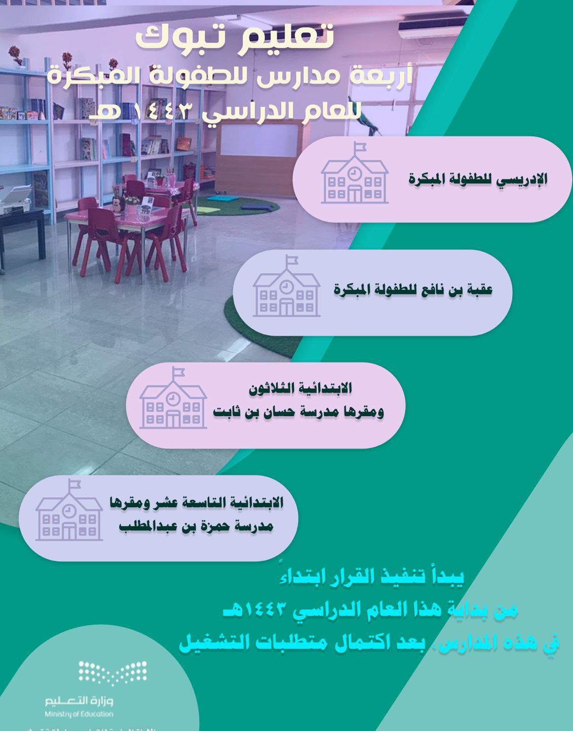 اعتمد المدير العام للتعليم بمنطقة تبوك، إبراهيم بن حسين العمري، أربعة مدارس للطفولة المبكرة للعام الدراسي الجديد 1443 هـ وهي مدارس: الإدريسي للطفولة المبكرة، عقبة بن نافع للطفولة المبكرة، الابتدائية التاسعة عشر ومقرها مدرسة حمزة بن عبدالمطلب والابتدائية الثلاثون ومقرها مدرسة حسان بن ثابت.