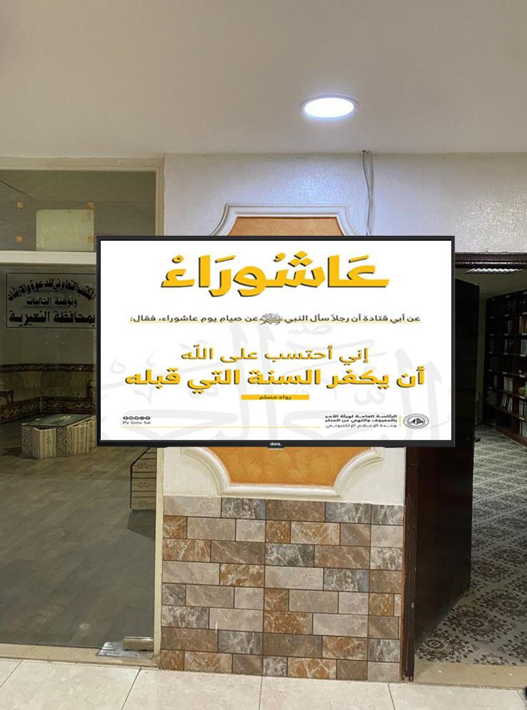 نفذ فرع الرئاسة العامة لهيئة الأمر بالمعروف والنهي عن المنكر بالمنطقة الشرقية برنامجاً توعوياً عن فضل شهر الله المحرم وصيام يوم عاشوراء عبر المنصات التوعوية والشاشات الإلكترونية المتاحة في الهيئات والأماكن العامة والأسواق التجارية .
