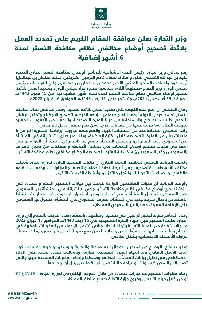 رفع معالي وزير التجارة، رئيس اللجنة الإشرافية للبرنامج الوطني لمكافحة التستر التجاري الدكتور ماجد بن عبدالله القصبي شكره وامتنانه لمقام خادم الحرمين الشريفين الملك سلمان بن عبدالعزيز آل سعود ولصاحب السمو الملكي الأمير محمد بن سلمان بن عبدالعزيز ولي العهد نائب رئيس مجلس الوزراء وزير الدفاع -حفظهما الله-، بمناسبة صدور قرار مجلس الوزراء بتمديد العمل بلائحة تصحيح أوضاع مخالفي نظام مكافحة التستر لمدة ستة أشهر إضافية تبدأ من 15 محرم 1443هـ الموافق 23 أغسطس 2021م، وتستمر حتى 15 رجب 1443هـ الموافق 16 فبراير 2022م.