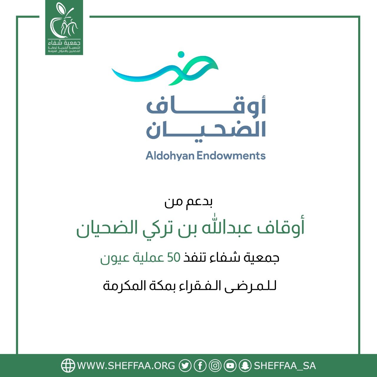 نفذت جميعة شفاء الصحية الخيرية ” ٥٠ ” عملية ” عيون ” للمرضى الفقراء بمنطقة مكة المكرمة ، و ذلك بدعم من أوقاف الشيخ / عبدالله بن تركي الضحيان ، وبرنامج عمليات العيون هو أحد برامج جمعية شفاء الرائدة وذو أثرٍ ملموس حيث يعمل على تحسين حياة المرضى الفقراء في مكة المكرمة .
