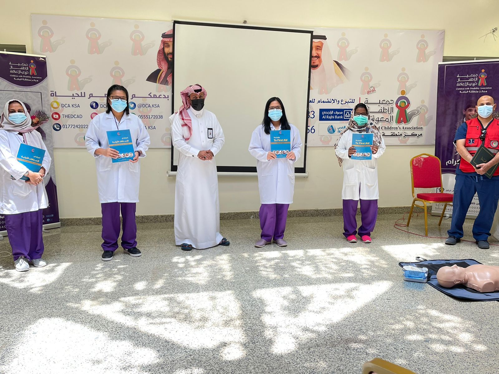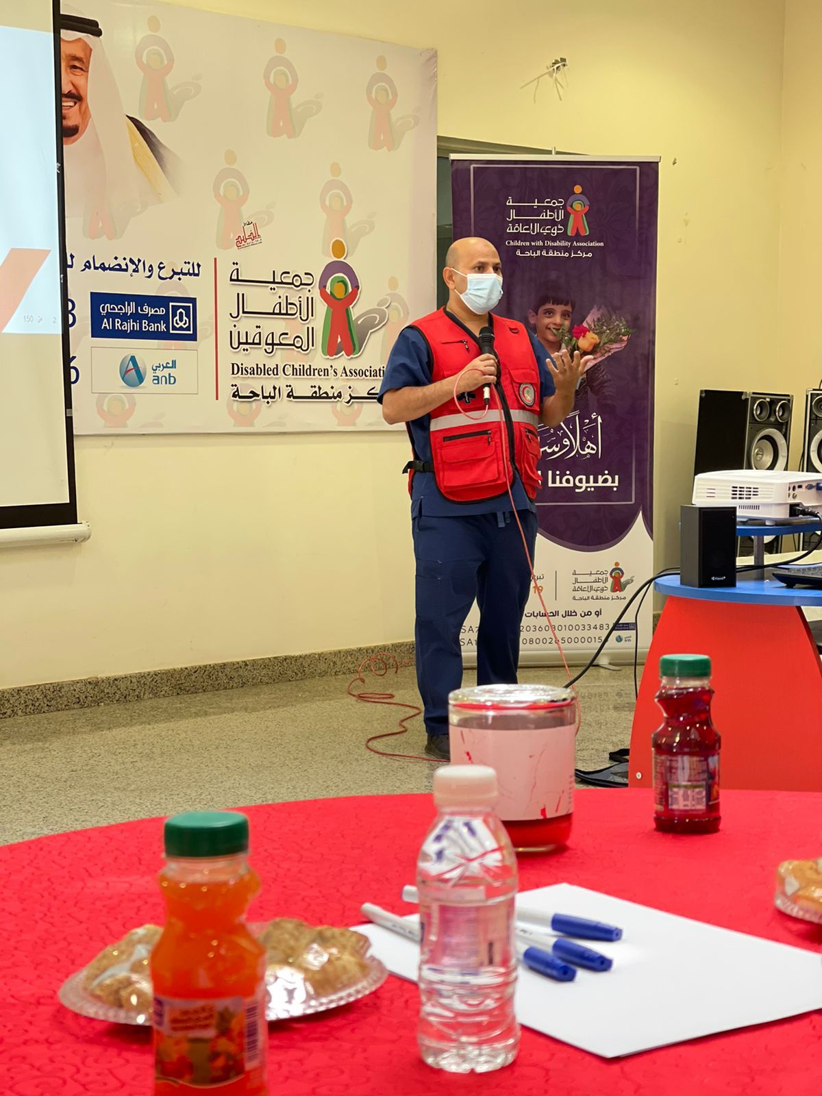 نفذ فرع هيئة الهلال الأحمر السعودي بمنطقة الباحة دورة اسعافيه لبرنامج الامير نايف مبادرة همة السفراء لمنسوبي جمعية الاطفال لذوي الاعاقه للإسعافات الأولية دورة سفير الحياه باشراف ودعم من مدير عام الفرع بالمنطقة الاستاذ خالد محمد الغامدي