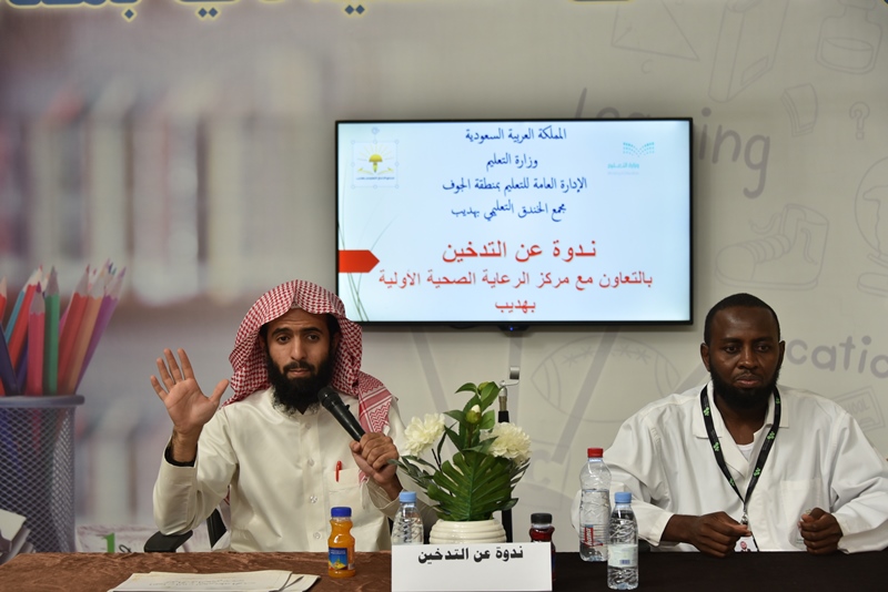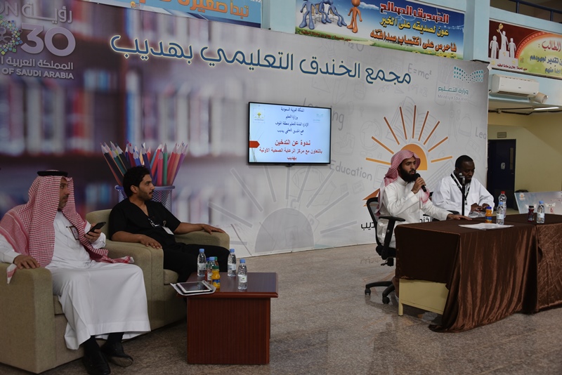 هذا و أقيمت ندوة توعوية للطلاب بالتعاون مع مركز الرعاية الصحية الأولية بهديب نفذها الدكتور آدم يوسف و مشاركة معلم الدين بالمجمع الأستاذ عبد الله المطوع ، بدأت الندوة بحديث الدكتور آدم عن أضرار التدخين و المكونات الكيميائية التي تدخل في انتاج السيجارة و تعتبر غالبيتها مواد سامة و ضارة ،و هي من المسببات الرئيسة للسرطان ، منوهًا بعلاقة التدخين بمختلف الأمراض بصورة مباشرة .