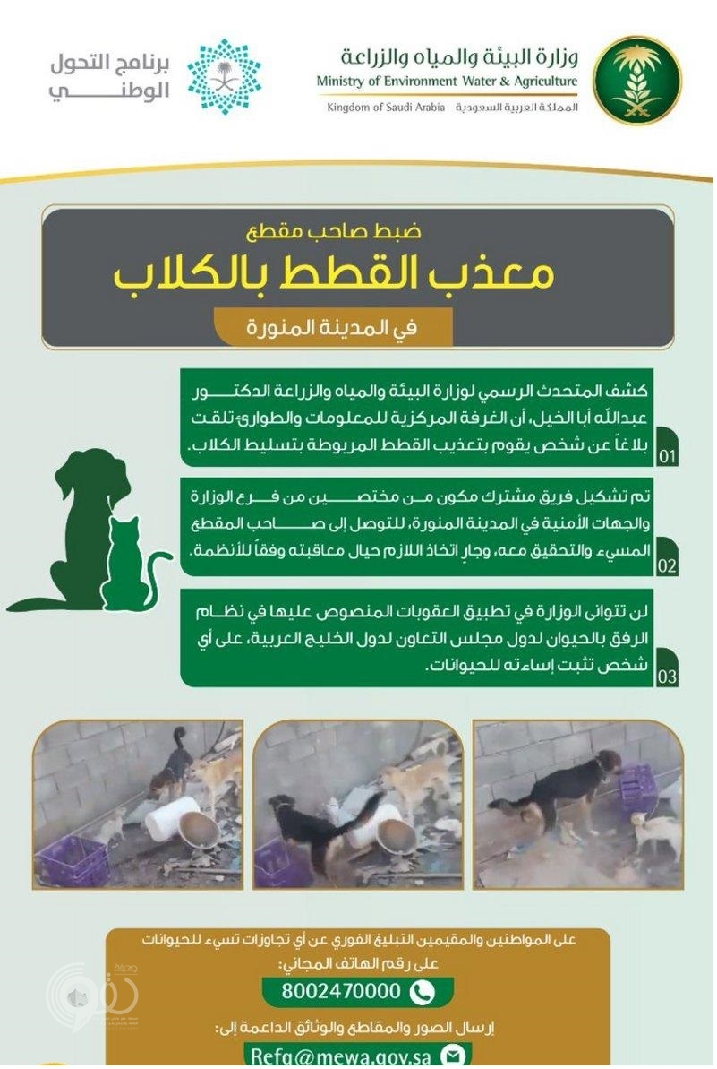 من جانبه، قال المتحدث الرسمي لوزارة البيئة والمياه والزراعة الدكتور عبدالله أبا الخيل، إن الغرفة المركزية للمعلومات والطوارئ تلقت بلاغا عن شخص يقوم بتعذيب القطط المربوطة بتسيلط الكلاب عليها.