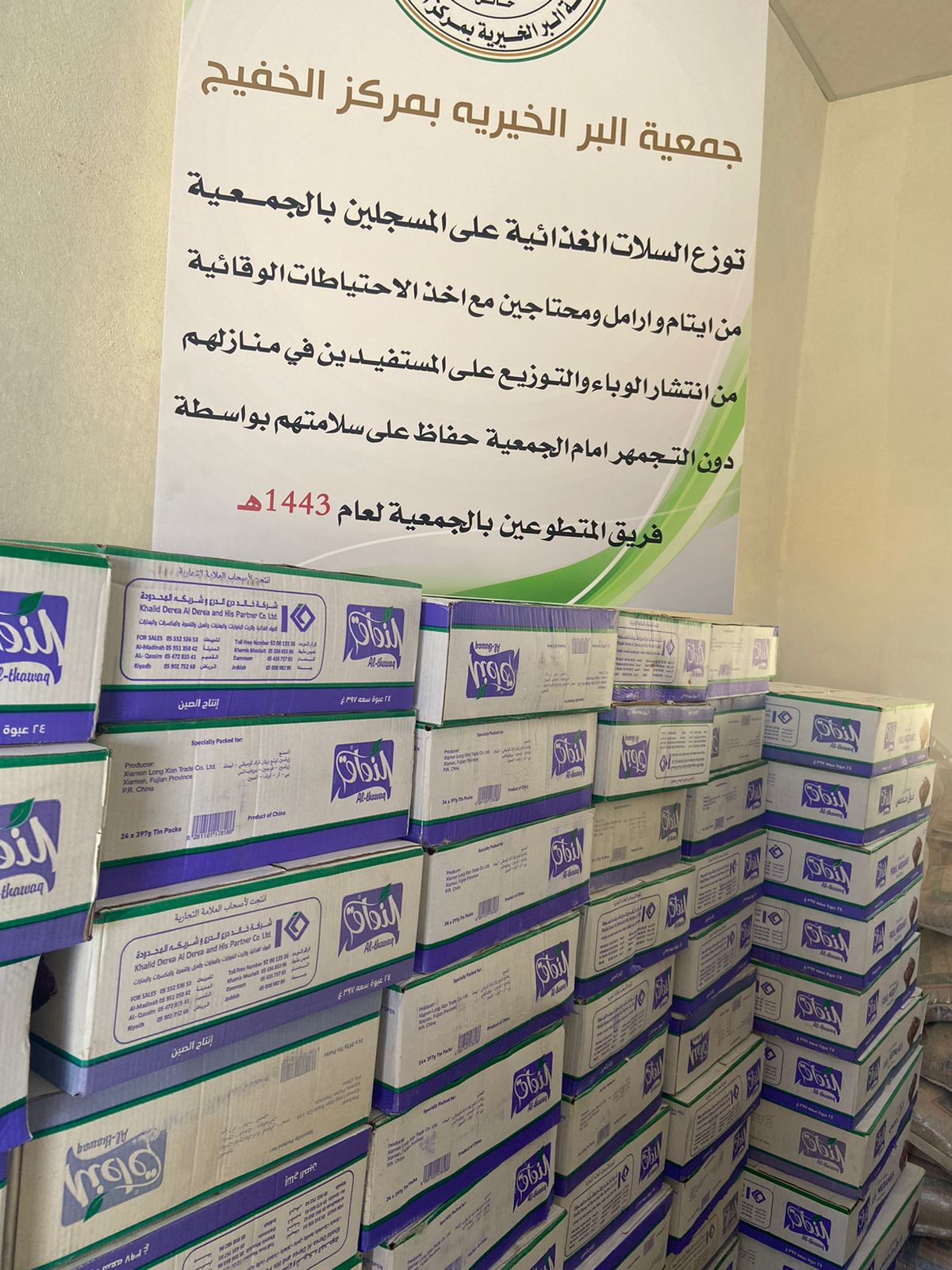 وصرح رئيس مجلس إدارة جمعية البر بالخفيج الاستاذ فرحان بن خزيم الوهيداني، لصحيفة الشمال الإلكترونية أن التوزيع على الأيتام والأرامل في منازلهم دون التجمهر أمام مستودع الخيرية، حفاظاُ على سلامتهم وتماشياً مع الأوامر والتعليمات المبلغة من الجهة المشرفة.