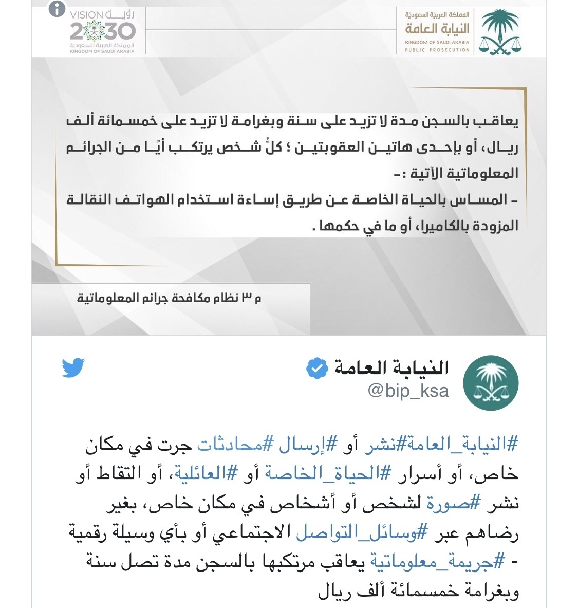 وقالت النيابة العامة خلال تغريدة نشرتها عبر حسابها الرسمي على ” تويتر” نشر أو إرسال محادثات جرت في مكان خاص، أو أسرار الحياة الخاصة أو العائلية، أو التقاط أو نشر صورة لشخص أو أشخاص في مكان خاص، بغير رضاهم عبر وسائل التواصل الاجتماعي أو بأي وسيلة رقمية جريمة معلوماتية يعاقب مرتكبها بالسجن مدة تصل سنة وبغرامة خمسمائة ألف ريال “.