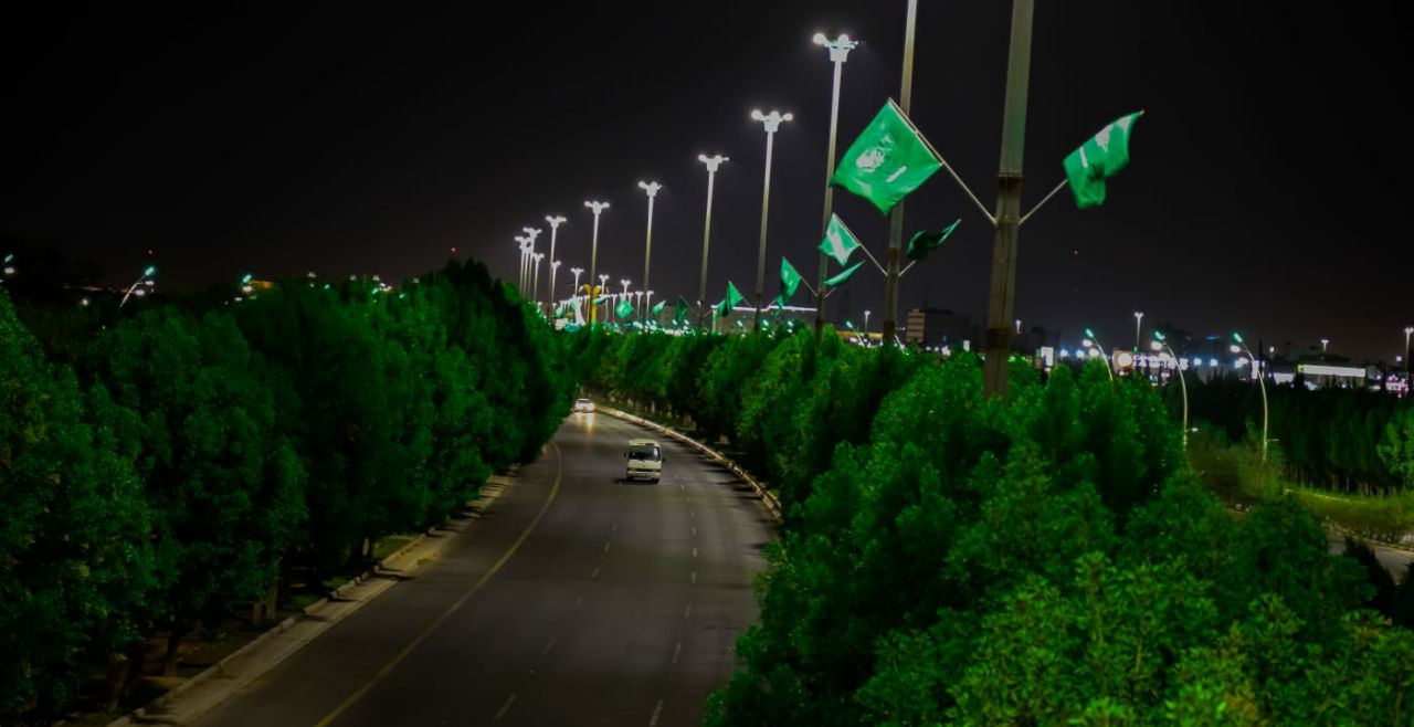 بالصور… أمانة تبوك تبرز مظاهر الاحتفاء باليوم الوطني من خلال تزيين شوارع وميادين المنطقة بالأعلام والإضاءات الخضراء