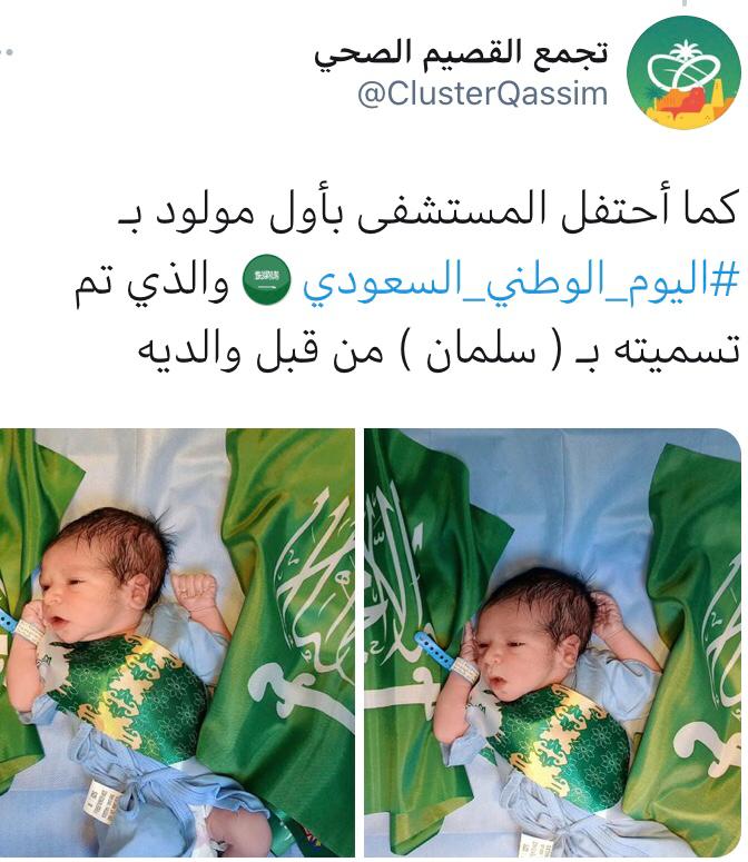 أعلن حساب تجمع القصيم عبر موقع التواصل الاجتماعي “تويتر” أن مستشفى الرس العام احتفل بأول مولود في اليوم الوطني السعودي الـ 91 بالمستشفى.