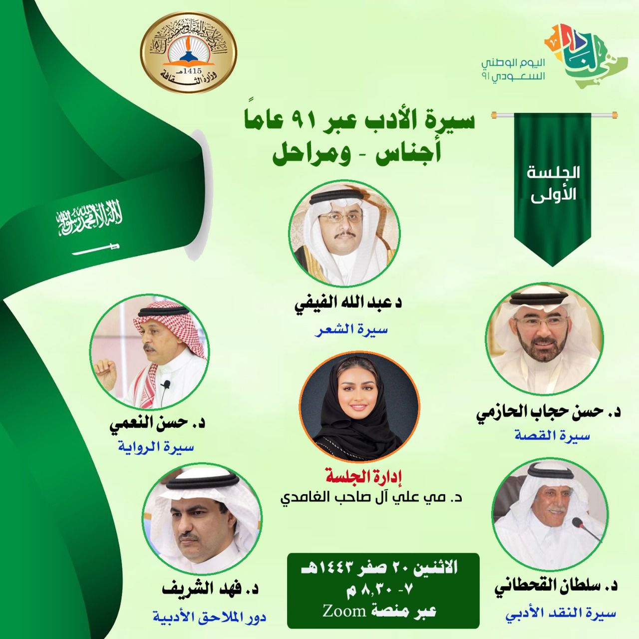 تحت رعاية صاحب السمو الملكي الأمير الدكتور حسام بن سعود أمير منطقة الباحة يقيم نادي الباحة الأدبي الثقافي ندوة أدبية مساء يوم الإثنين ٢٠ صفر ١٤٤٣هـالموافق ٢٧ /٩ / ٢٠٢١م عبر منصة (الزوم)تحت عنوان سيرة الأدب السعودي عبر ٩١ عام – أجناس – ومراحل