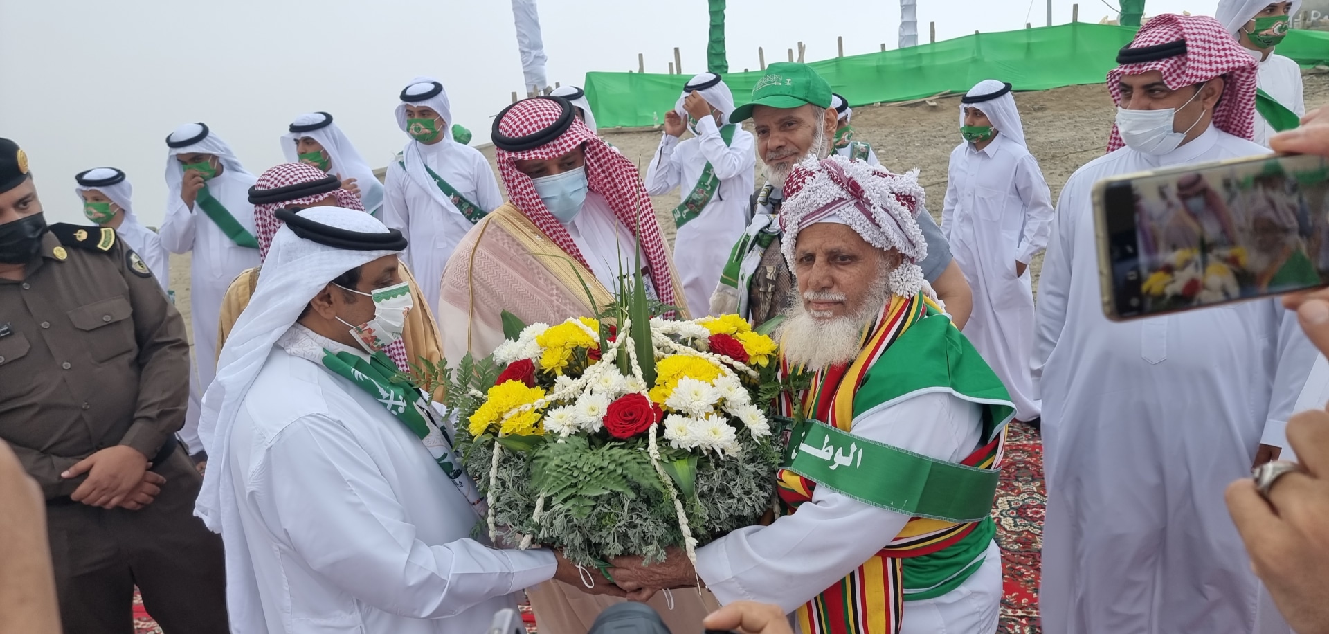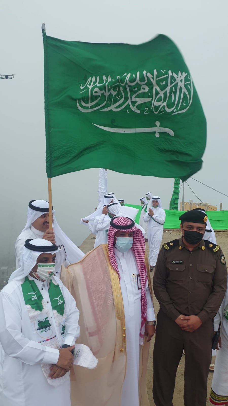 احتفالية وطنية رسمت لوحة فنية توشحت فيها قمة اللعثة باللون الاخضر وتزينت بالإعلام تعبيرا عن صدق الانتماء والولاء والاعتزاز بتاريخ الوطن المجيد ورموزه وحضارته وتراثه، وتأكيداً على اللحمة الوطنية والترابط الوثيق بين الشعب وقيادته الرشيدة .