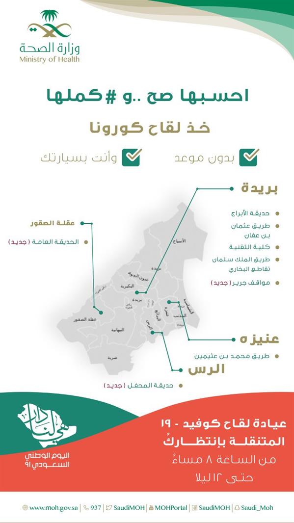 وحددت الحديقة العامة لمنح اللقاح في عقلة الصقور، وطريق محمد بن عثيمين في عنيزة، وحديقة المحفل بالرس.