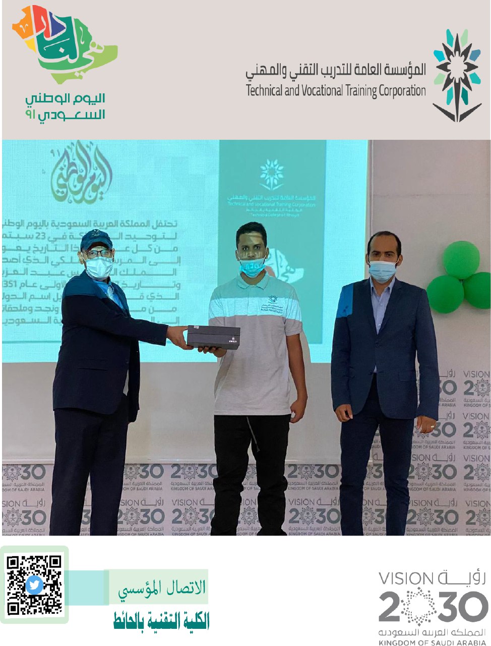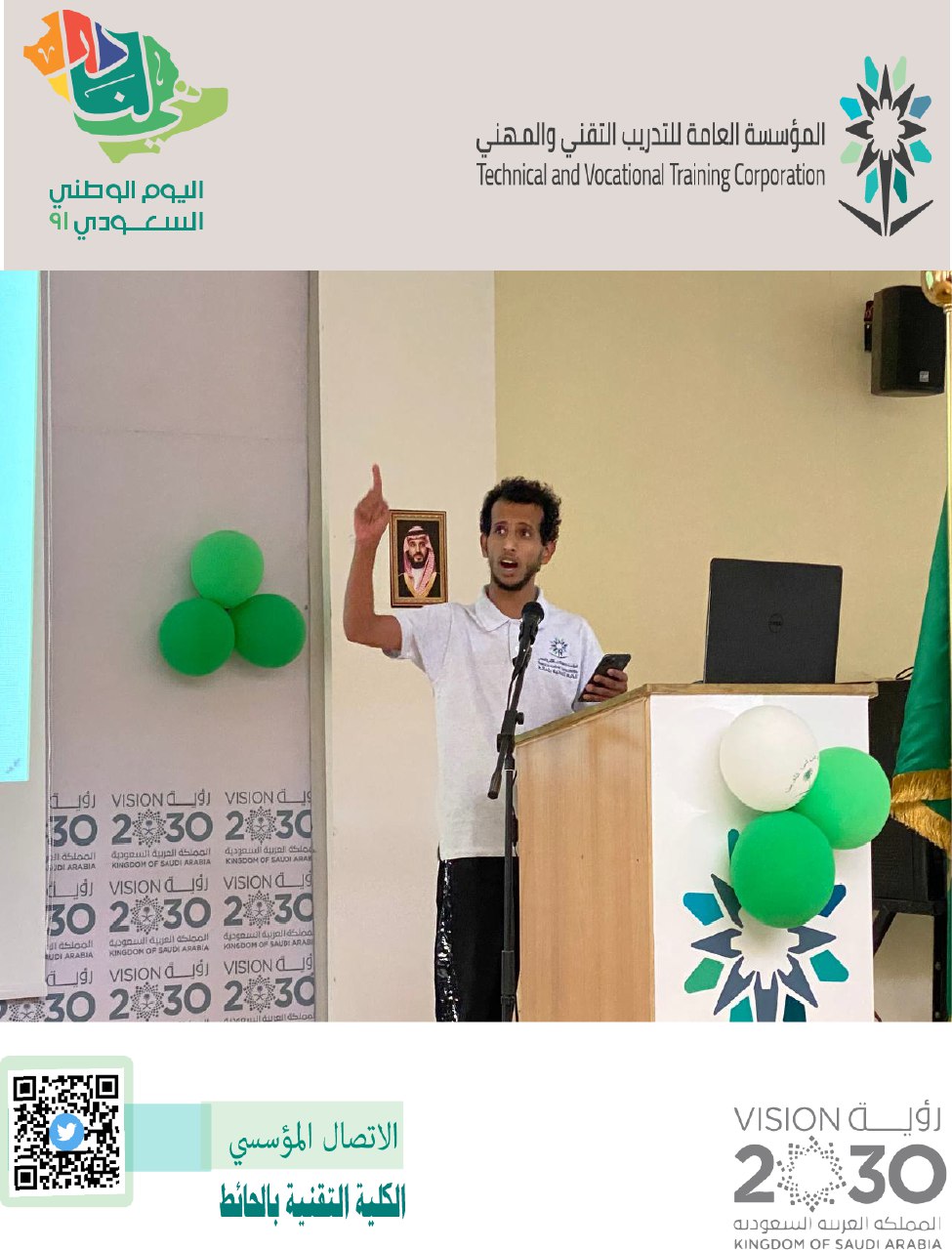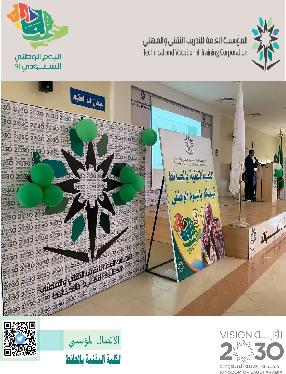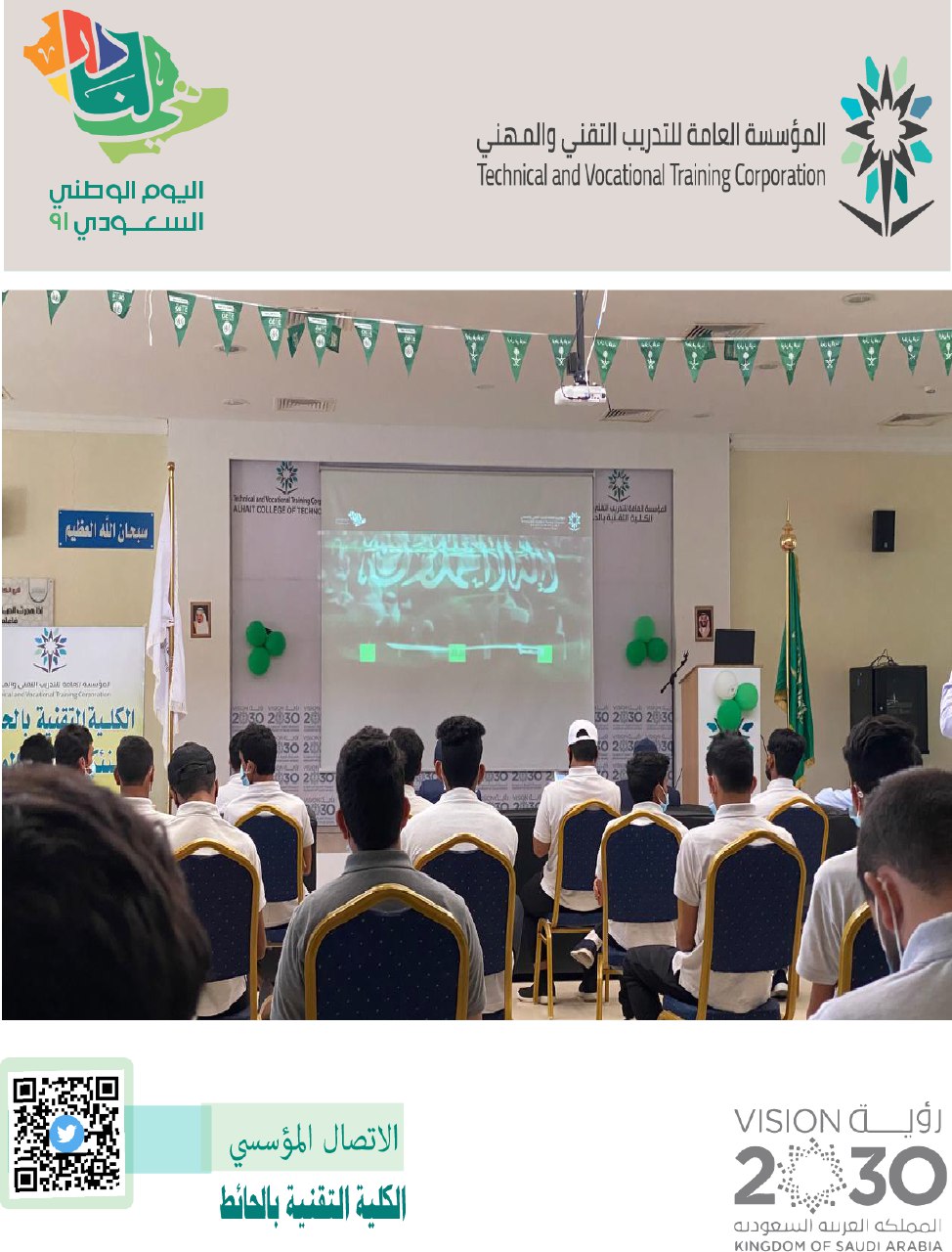 أقامت الكلية التقني بمحافظة الحائط ممثلة بوحدة الأنشطة الطلابية في يوم الأحد الموافق 19-2 – 1443 احتفال في قاعة الكلية بمناسبة مرور 91 عامًا على تأسيس المملكة العربية السعودية.