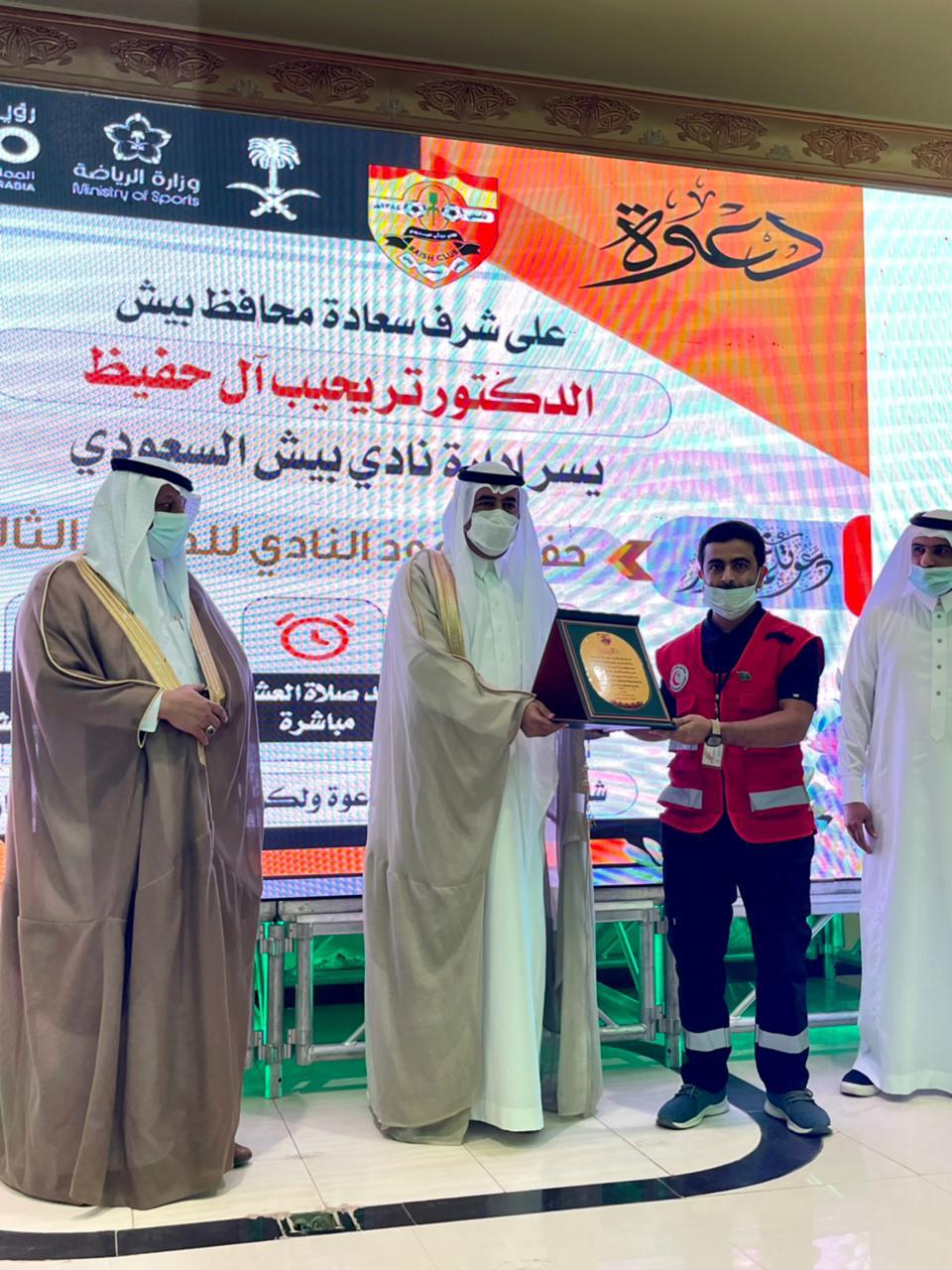 وثمّن رئيس نادي بيش دعم و تشجيع وتحفيز المحافظ واهتمامه الدائم بالنادي لبذل قصارى الجهد للصعود للدرجة الثانية، معبراً عن تقدير جميع منسوبي النادي وشكرهم نظير جهوده الدائمة بعده قام المحافظ ومدير مكتب الرياضة بجازان ورئيس نادي بيش بتكريم الداعمين من الأهالي على دعمهم لخدمة أبناء النادي.