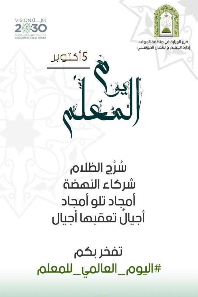 تفاعل فرع وزارة الشؤون الإسلامية والدعوة والإرشاد بمنطقة الجوف مع اليوم العالمي للمعلم الذي يتوافق مع اليوم الخامس من شهر أكتوبر كل عام، بنشر تصاميم وبروشورات تحمل رسائل تقدير وعرفان بالدور الذي يقدمه المعلم والمعلمة في بناء العقول وتنشئة الاجيال ليكونوا نواةً صالحة للمستقبل .