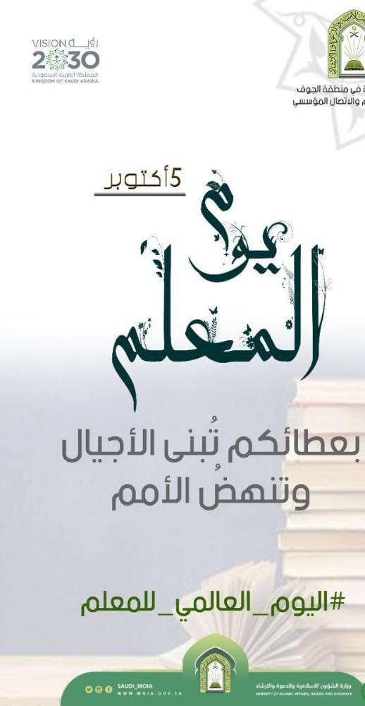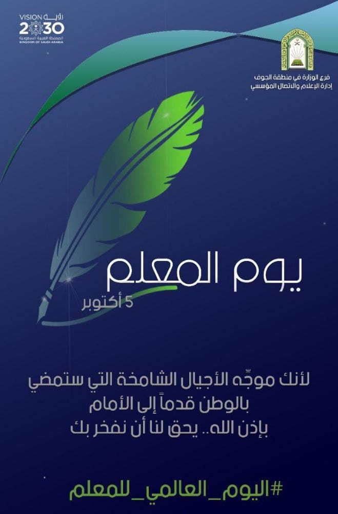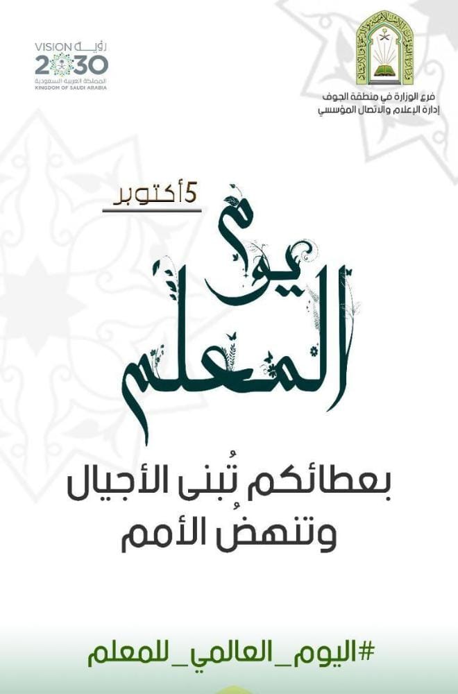 تفاعل فرع وزارة الشؤون الإسلامية والدعوة والإرشاد بمنطقة الجوف مع اليوم العالمي للمعلم الذي يتوافق مع اليوم الخامس من شهر أكتوبر كل عام، بنشر تصاميم وبروشورات تحمل رسائل تقدير وعرفان بالدور الذي يقدمه المعلم والمعلمة في بناء العقول وتنشئة الاجيال ليكونوا نواةً صالحة للمستقبل .