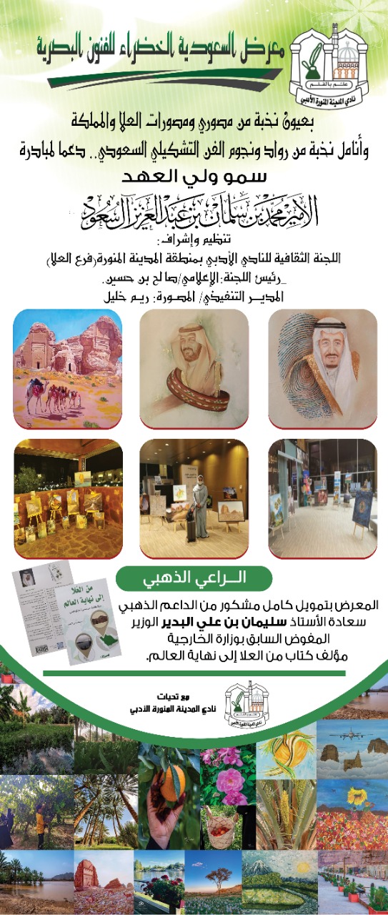 يذكر بأن معرض السعودية الخضراء للفنون البصرية،من فكرة وتخطيط وإشراف المستشار الإعلامي صالح بن حسين،مسؤول اللجنة الثقافية للنادي الأدبي الثقافي بمنطقة المدينة المنورة(فرع العلا)وإدارة تنفيذية من قبل المصورة الفنانة التشكيلية الأستاذة ريم خليل،التي تولت الإشراف على طباعة مجموعة صخمة من الصور الفوتوغرافية وترحيلها من جدة إلى العلا