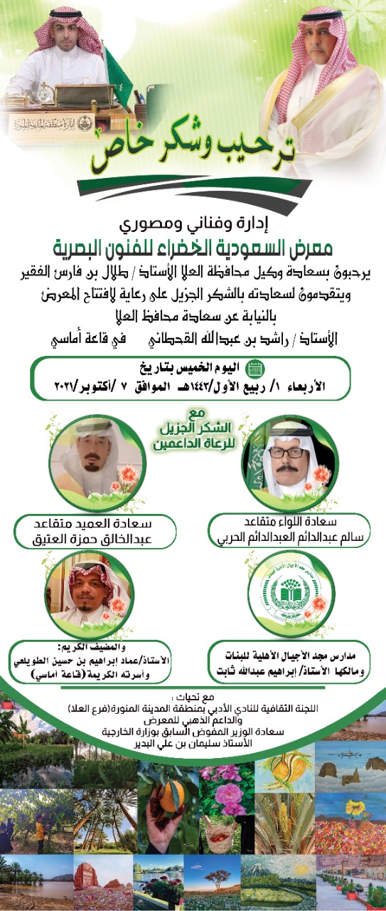 يرعى سعادة وكيل محافظة العلا الأستاذ طلال بن فارس الفقير مساء اليوم الخميس بعد صلاة المغرب في قاعة أماسي العلا)بضيافة كريمة من قبل الأستاذ عماد إبراهيم بن حسين الطويلعي وأسرته،العرض الافتتاحي الرسمي الكبير لمعرض السعودية الخضراء للفنون البصرية بالعلا.