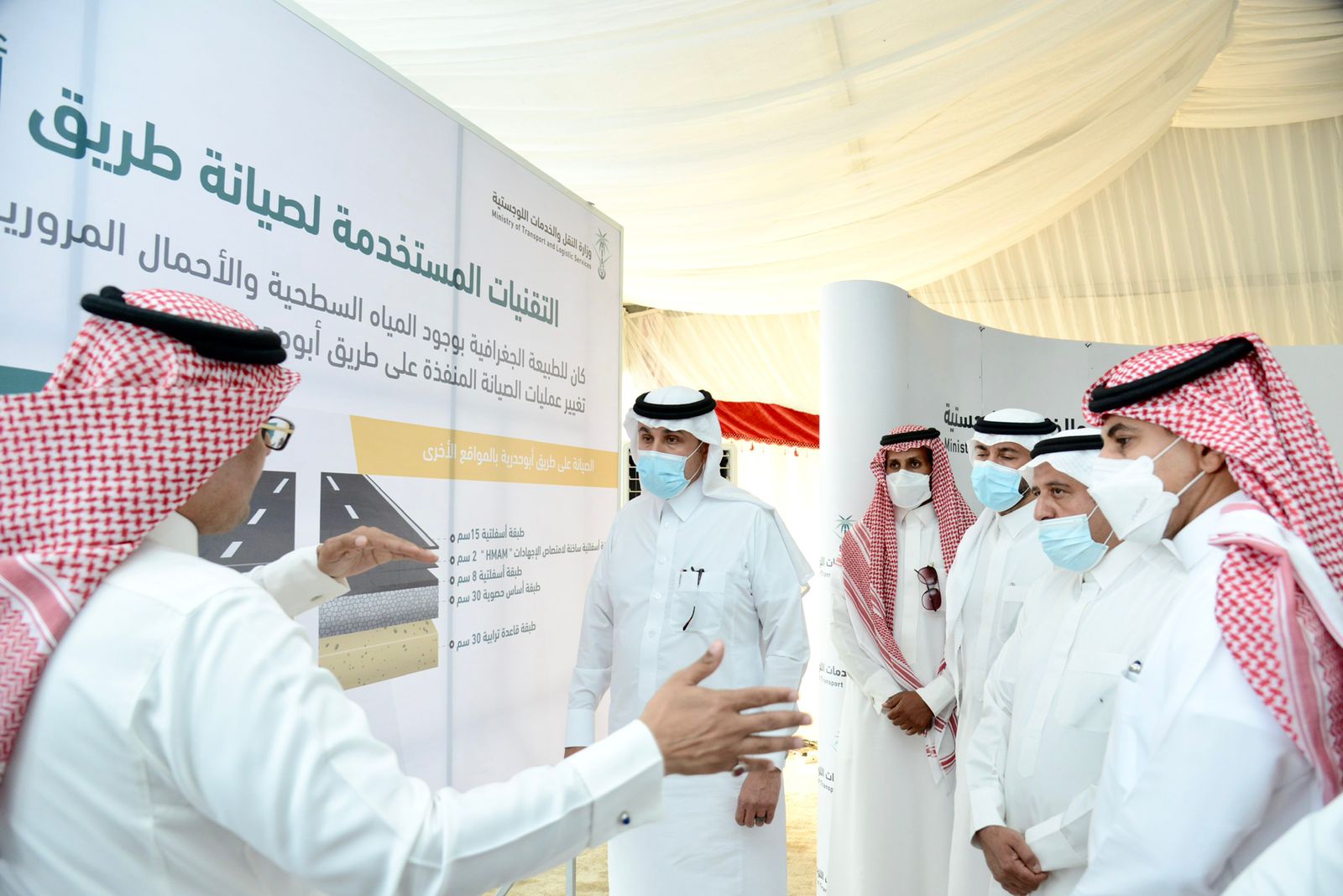 كما استعرض ما قامت به الوزارة من أبحاث وتجارب عملية لضمان جودة الطريق لمواجهة التحديات التي اثرت على الطريق والتي تمثلت في مرور الطريق في بعض المواقع ذات المياه السطحية العالية (سبخة) والكثافة المرورية العالية على الطريق والتي تصل (٦٠) الف مركبة يوميًا نسبة الشاحنات بها (٣٦٪؜) ،