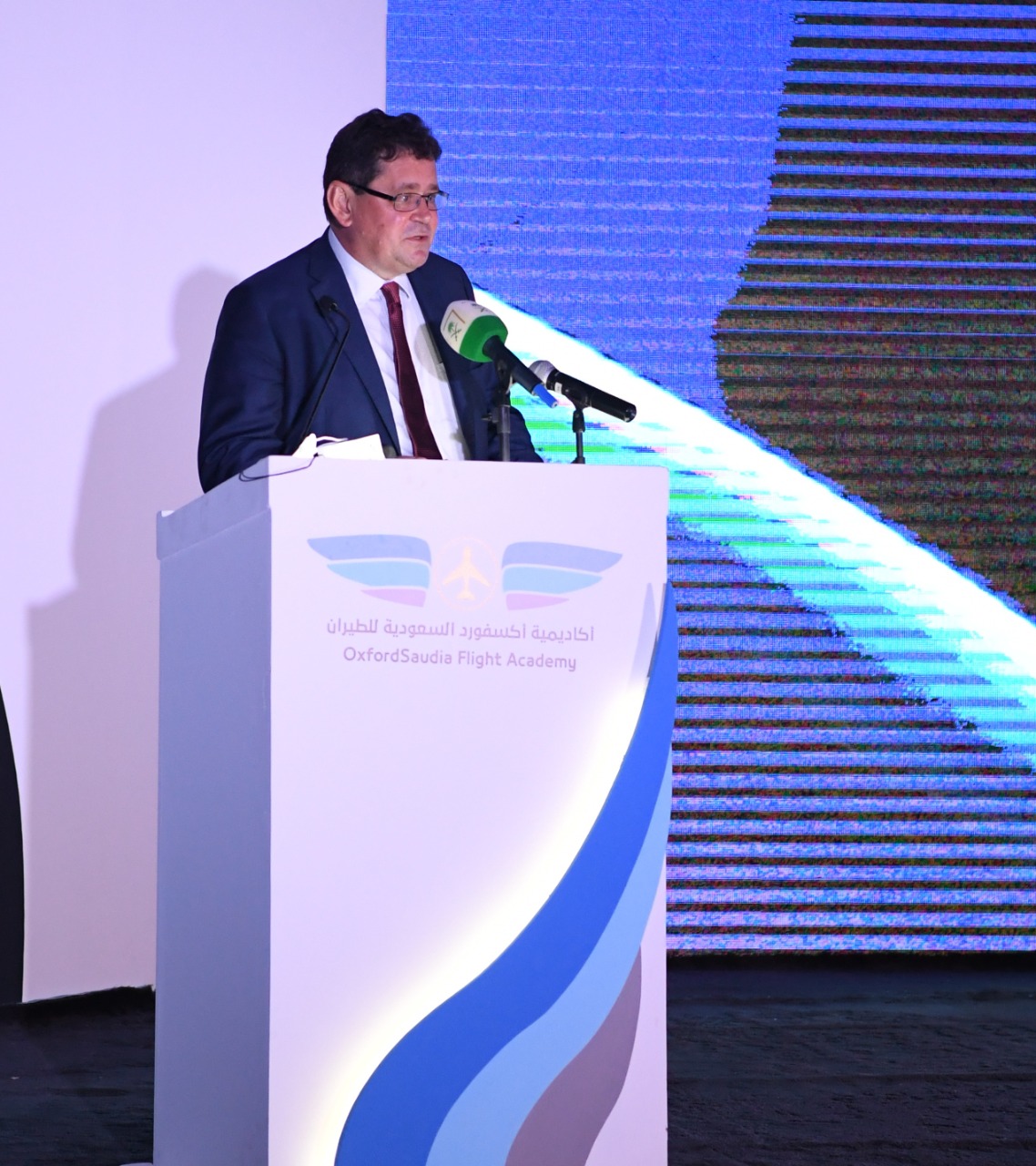 ورفع الكابتن عثمان المطيري رئيس مجلس إدارة أكاديمية أكسفورد السعودية شكره لسمو أمير الشرقية على رعايته الحفل مؤكداً بأن المملكة وفق الممكنات التي وفرتها الدولة مهيأة لأن تصبح وجهة لتدريب الطيارين ويقصدها الكثيرين على مستوى العالم.