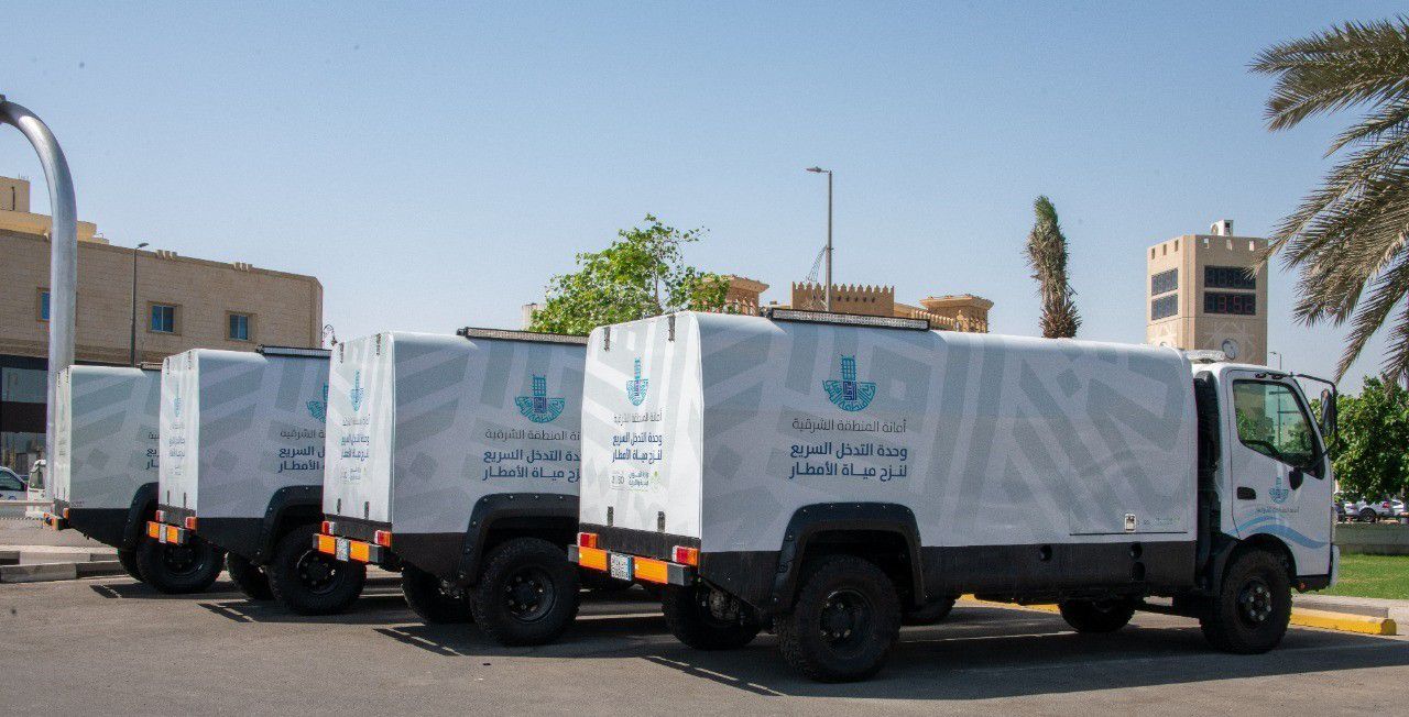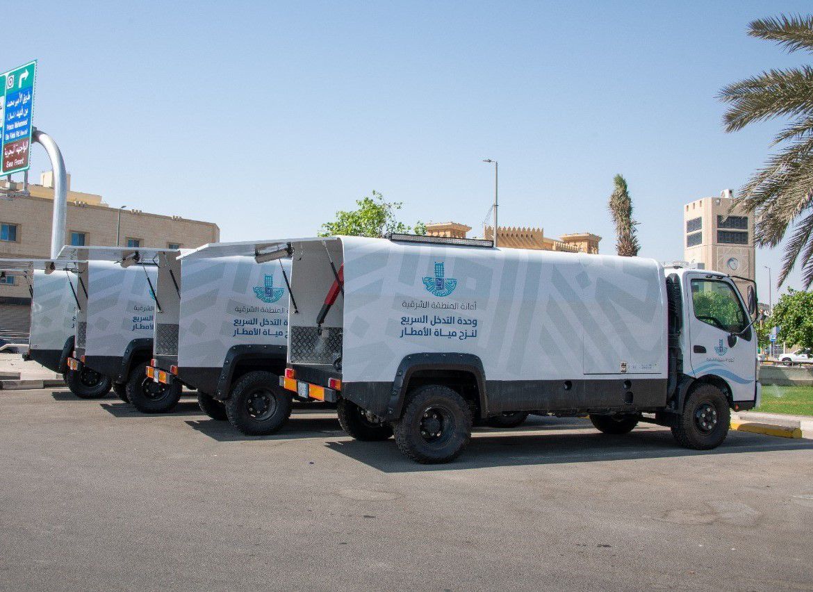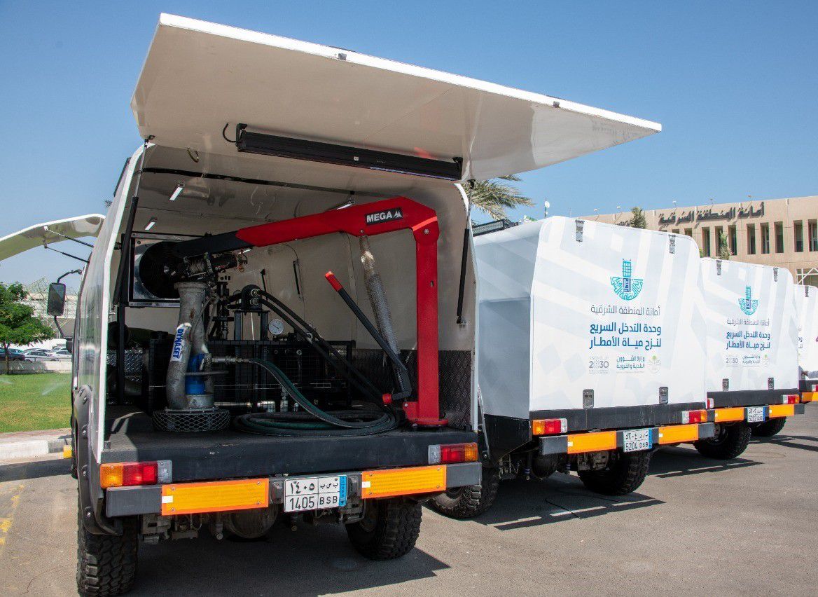 وأوضح وكيل الأمين للتعمير والمشاريع المهندس مازن بن عادل بخرجي، أن التقنيات التي حرصت أمانة الشرقية على توفيرها وزيادة عددها للاستعداد لموسم الأمطار، والتي سيعمل عليها مركز الأزمات والمخاطر في وكالة التعمير والمشاريع، تمثّلت في وحدة التدخل السريع لنزح مياه الأمطار، وهي عبارة عن شاحنات تُعنى بنزح مياه الأمطار عبر مضخات مُدّعمة بها، إذ أنها تقوم بالوصول في وقت قصير للمواقع المتضررة بالمياه، حيث تتكون من مضخة هيدروليكية، وخراطيم هيدروليكية وخراطيم نزح مياه الأمطار، ومضخة غاطسة، تعمل على مدار 24 ساعة وتبلغ قدرتها لنزح المياه 720 متر مكعب في الساعة، وتعمل ضمن منظومة معالجة الأمطار التي طورتها للتدخل السريع وتنقلها للمواقع المستهدف معالجتها في مدة زمنيه أقل لنزح مياه الأمطار وتركز بشكل أكبر على سرعة الاستجابة.)