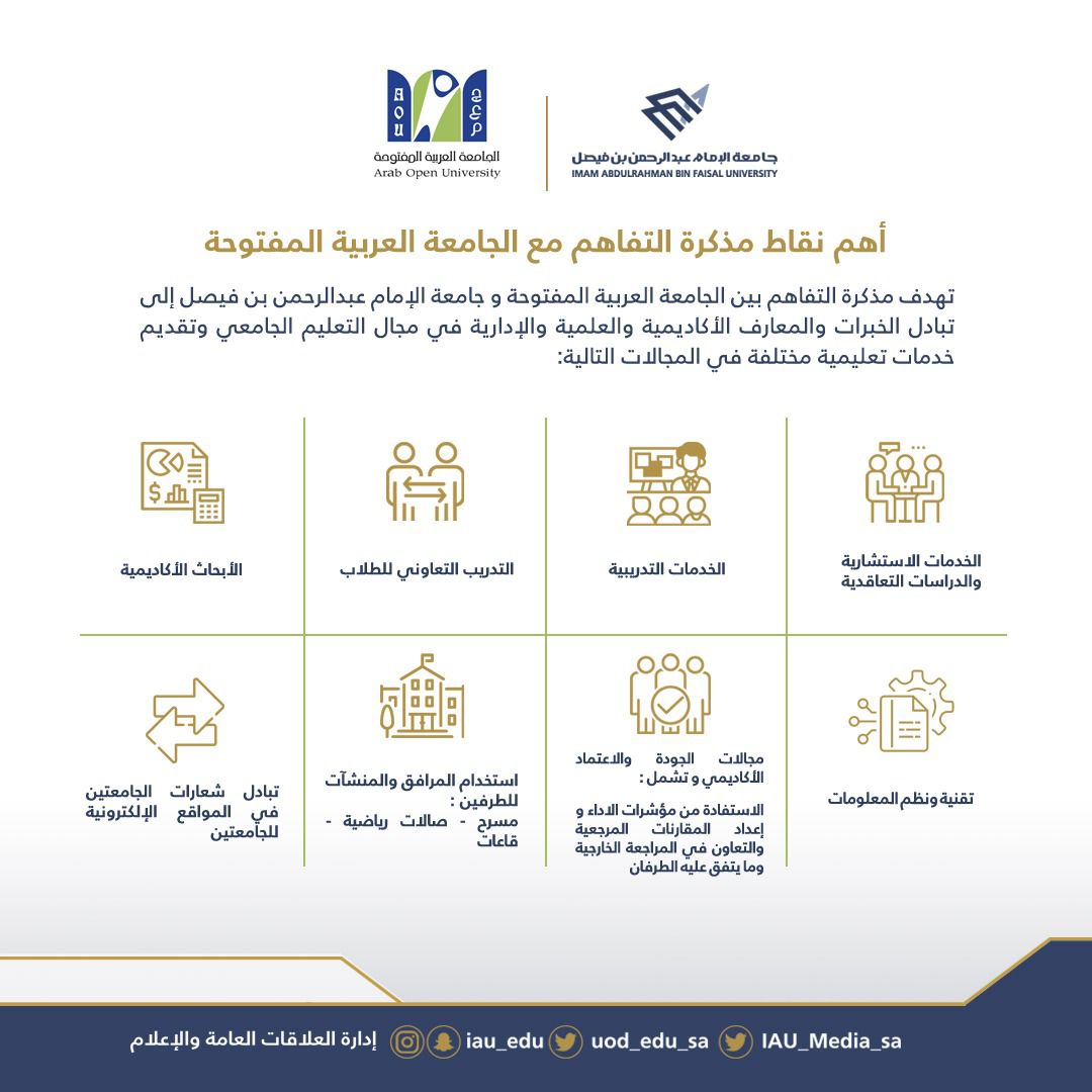 وذكر الدكتور عبدالله الربيش بان هذه الاتفاقية هدفها هو استعانة الجامعة العربية المفتوحة بخبرات جامعة الامام عبدالرحمن بن فيصل في تقديم خدمات مختلفة في مجال الخدمات الاستشارية والدراسات التعاقدية و الخدمات التدريبية و التدريب التعاوني للطلاب و الأبحاث الأكاديمية وتقنية ونظم المعلومات ومجالات الجودة والاعتماد الأكاديمي، والتي تشمل الاستفادة من مؤشرات الاداء، اعداد المقارنات المرجعية والتعاون في المراجعة الخارجية وما يتفق عليه الطرفان ، و استخدام المرافق والمنشآت للطرفين من مسارح و صالات رياضية و قاعات إضافة الى تبادل شعارات الجامعتين في المواقع الإلكترونية للجامعتين.