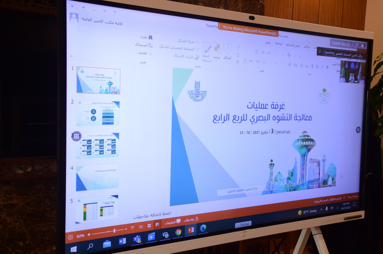وفي بداية الاجتماع اطلع معاليه على عرض، لغرفة عمليات معالجة التشوه البصري، قدمه وكيل الأمين للتعمير والمشاريع المهندس مازن بن عادل بخرجي، والذي تضمّن مؤشرات المعالجة خلال الأسبوع الماضي في المنطقة الشرقية، حيث تم معالجة (53.299) متر مكعب من مخلفات البناء والهدم، ومعالجة (1.183) متر طولي من الكتابات المشوهة، ورفع وإزالة (201) سيارة تالفة، وكذلك معالجة (941) حاوية نظافة، ودهان (58.572) متر طولي من الأرصفة والخطوط الأرضية، ومعالجة (1247) من حواجز الحفريات، ومعالجة (12.734) متر مربع من حفر الشوارع، إضافة الى معالجة (195) من أعمدة الإنارة، ومعالجة (4.103) متر طولي من الأرصفة المتهالكة.