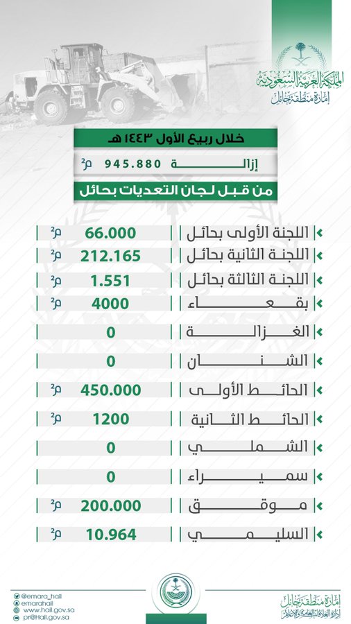 كما أزالت لجان التعديات في محافظة بقعاء 4 آلاف م²، بينما أزالت اللجنة الأولى في محافظة الحائط 450 ألف م²، واللجنة الثانية 1200م²، إضافة لإزالة 200 ألف م² بمحافظة موقق ، وكذلك إزالة 10.964م² في محافظة السليمي .