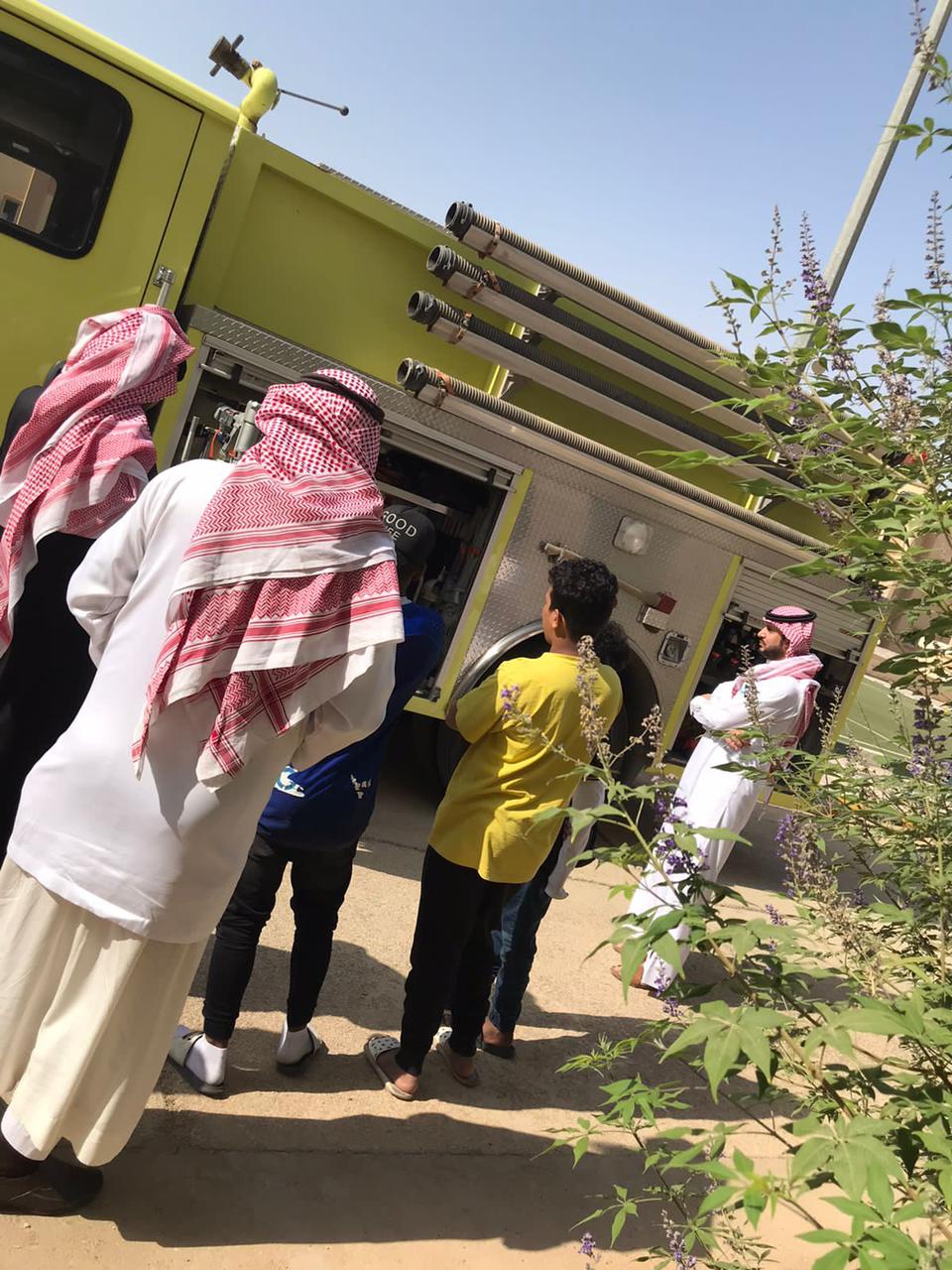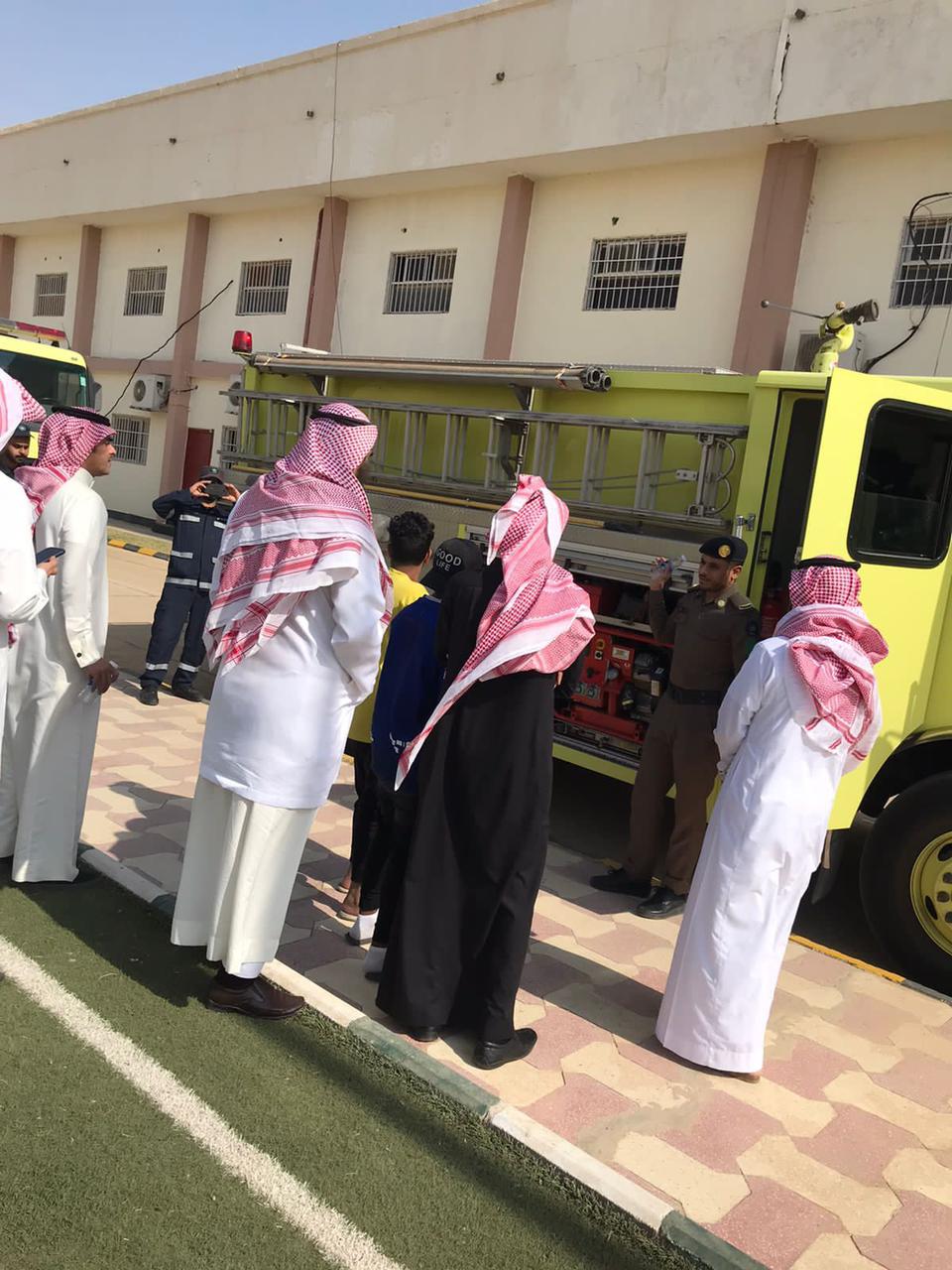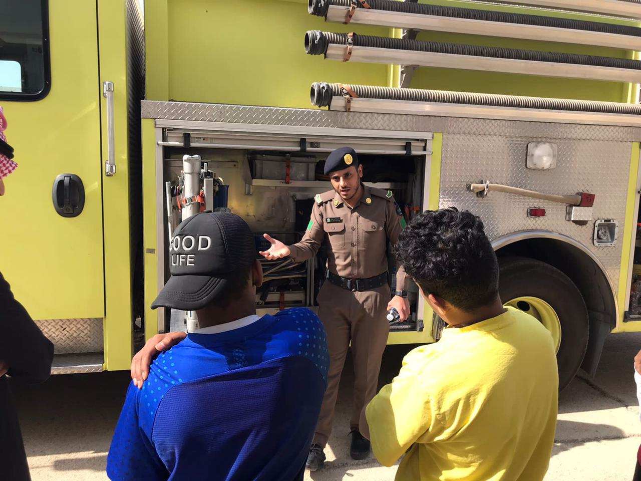 وقد بدأت الفعاليات عند الإنذار خروج الجميع لنقطة التجمع وتعليم الابناء على طفايات الحريق وطريقة الاستخدام ومعرفة انواع طفايات الحريق ؛ وشرح أدوات الإطفاء الموجوده بالسيارة وشرح وسائل السلامه المستخدمة لرجل الإطفاء من ملابس واسطوانة اكسجين وقفازات الأيدي المستخدمة للحريق والانقاذ وخوذة للرأس للوقايه وأجهزة صوتيه مستخدمه لرجل الإطفاء …